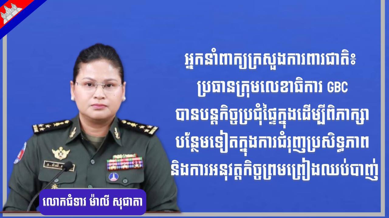 លោកជំទាវឧត្តមសេនីយ៍ឯក ម៉ាលី សុជាតា អ្នកនាំពាក្យក្រសួងការពារជាតិថ្លែងក្នុងសេចក្តីសង្ខេបព័ត៌មានប្រចាំថ្ងៃស្តីពី «លទ្ធផលនៃការអនុវត្តបទឈប់បាញ់រវាងកម្ពុជា-ថៃ» នាវេលាម៉ោង ១១:០០ ព្រឹកថ្ងៃទី០៥ ខែសីហា ឆ្នាំ២០២៥ បានមានប្រសាសន៍ថា ពាក់ព័ន្ធនឹងកិច្ចប្រជុំ GBC ដែលដឹកនាំដោយឧត្តមសេនីយ៍ទោ ស៊ិន សុខា ប្រធានក្រុមលេខាធិការ GBC បានបន្តកិច្ចប្រជុំផ្ទៃក្នុងដើម្បីពិភាក្សាបន្ថែមទៀតក្នុងការជំរុញប្រសិទ្ធិភាព និងភាពជឿជាក់អំពីការអនុវត្តកិច្ចព្រមព្រៀងឈប់បាញ់ និងការកសាងទំនុកចិត្តគ្នាជាមួយភាគីថៃ។