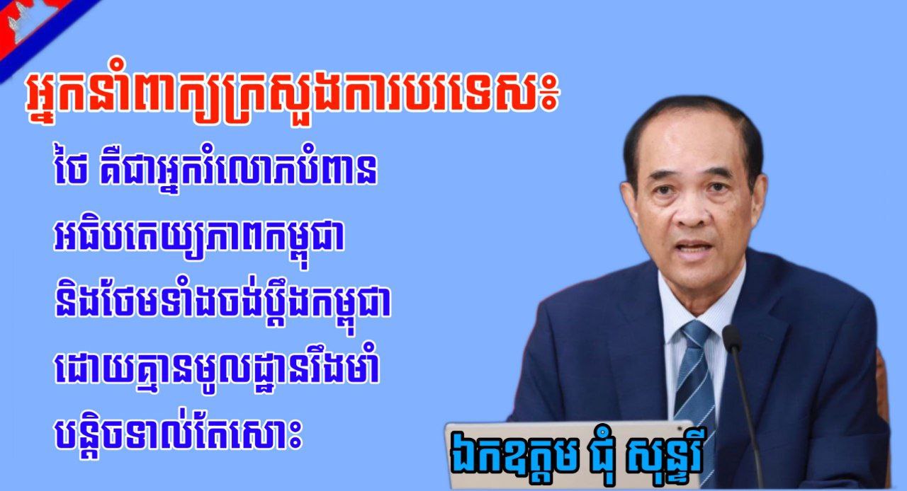 ឯកឧត្តម ជុំ សុន្ទរី រដ្ឋលេខាធិការ និងជាអ្នកនាំពាក្យក្រសួងការបរទេស និងសហប្រតិបត្តិការអន្តរជាតិ បានថ្លែងថា កម្ពុជាបានកត់សម្គាល់ដល់ការរំខានចិត្តនូវរបាយការណ៍លើកឡើងតាមប្រព័ន្ធឃោសនាថៃមួយចំនួន កាលពីថ្ងៃទី៥ ខែសីហា ឆ្នាំ២០២៥ អំពីសកម្មភាពផ្លូវច្បាប់ប្រឆាំងកម្ពុជា ដែលបានប្រកាសឡើងដោយរាជរដ្ឋាភិបាលប្រទេសថៃ ដែលវិធានច្បាប់នេះ គឺពុំមានមូលដ្ឋានសោះឡើយ ហើយនិងបង្ហាញឱ្យឃើញថា ប៉ុនប៉ងដោយដោយចេតនា ដើម្បីបង្វែរការចាប់អារម្មណ៍របស់សាធារណៈមតិថៃ និងអន្តរជាតិ ពីនយោបាយអមិត្តរបស់ថៃប្រឆាំងនឹងកម្ពុជា ជាពិសេសគឺការវាយប្រហារដោយឥតមូលហេតុប្រឆាំងទឹកដីរបស់កម្ពុជា។