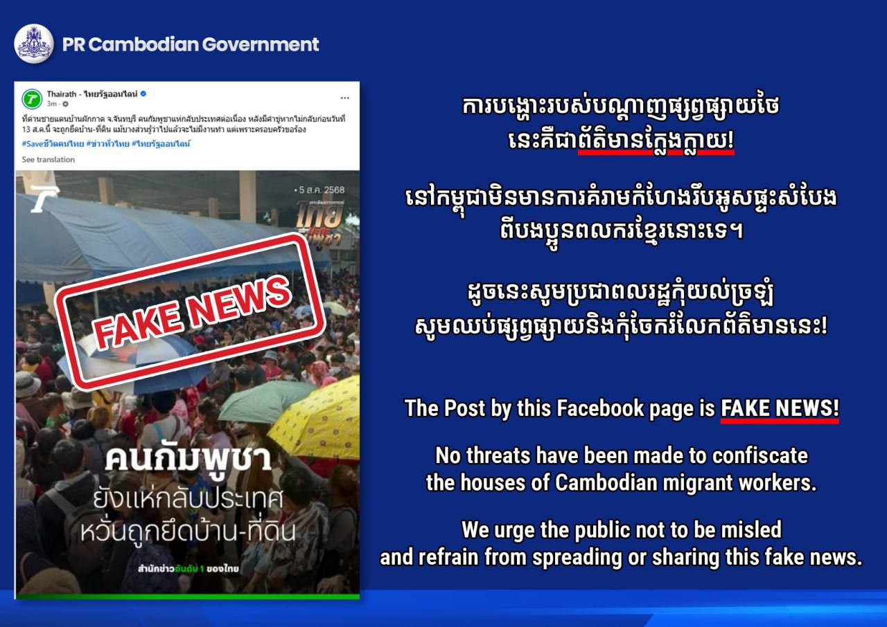 នៅយប់ថ្ងៃទី៦ ខែសីហា ឆ្នាំ២០២៥ PR Cambodian Government បានគូសបញ្ជាក់ថាការបង្ហោះរបស់បណ្ដាញផ្សព្វផ្សាយថៃនេះគឺជាព័ត៌មានក្លែងក្លាយ!