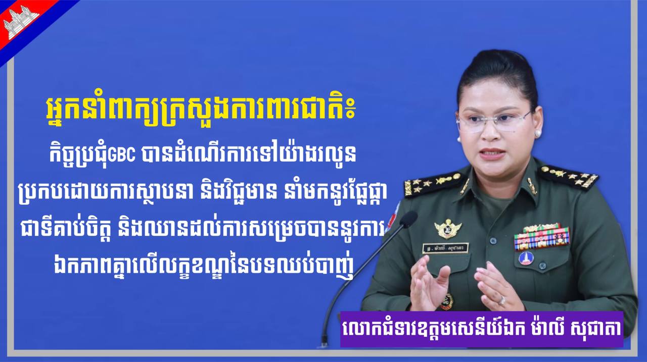 លោកជំទាវឧត្តមសេនីយ៍ឯក ម៉ាលី សុជាតា អ្នកនាំពាក្យក្រសួងការពារជាតិថ្លែងក្នុងសេចក្តីសង្ខេបព័ត៌មានប្រចាំថ្ងៃស្តីពី «លទ្ធផលនៃការអនុវត្តបទឈប់បាញ់រវាងកម្ពុជា-ថៃ» នាព្រឹកថ្ងៃទី០៨ ខែសីហា ឆ្នាំ២០២៥ បានមានប្រសាសន៍ថា កិច្ចប្រជុំGBCនេះ បានដំណើរការទៅដោយរលូនតាមកម្មវិធី បរិយាកាសនៃការពិភាក្សាប្រកបដោយការស្ថាបនា និងវិជ្ជមាន នាំមកនូវផ្លែផ្កាជាទីគាប់ចិត្ត និងឈានដល់ការសម្រេចបាននូវការឯកភាពគ្នារបស់ភាគីទាំងពីរ លើលក្ខខណ្ឌនៃបទឈប់បាញ់ និងការរៀបចំយន្តការសម្រាប់អនុវត្ត ជាជំហានដែលភាគីទាំងពីរត្រូវធ្វើ ដើម្បីឈានដល់ការរក្សាបានបទឈប់បាញ់ ដែលជាការត្រួសត្រាយផ្លូវដល់ការស្វែងរកដំណោះស្រាយដោយសន្តិវិធី ការស្តារឡើងវិញនូវប្រក្រតីភាព ជាមួយនឹងគោលដៅនាំមកវិញនូវសន្តិភាព ស្ថិរភាព កិច្ចសហប្រត្តិការ និងការអភិវឌ្ឍ សម្រាប់ប្រជាជននៃប្រទេសទាំងពីរ។