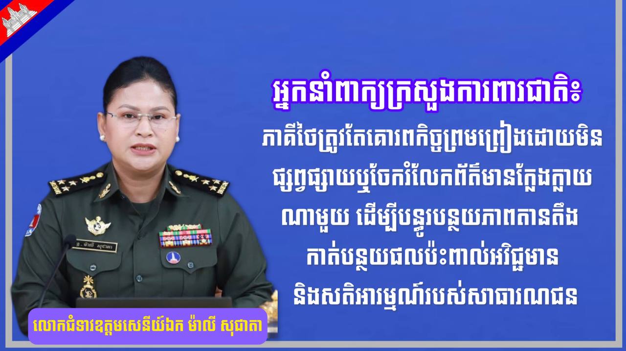 អ្នកនាំពាក្យក្រសួងការពារជាតិ៖ ភាគីថៃត្រូវតែគោរពកិច្ចព្រមព្រៀងដោយមិនផ្សព្វផ្សាយឬចែករំលែកព័ត៌មានក្លែងក្លាយណាមួយដើម្បីបន្ធូរបន្ថយភាពតានតឹង កាត់បន្ថយផលប៉ះពាល់អវិជ្ជមាន និងសតិអារម្មណ៍របស់សាធារណជន