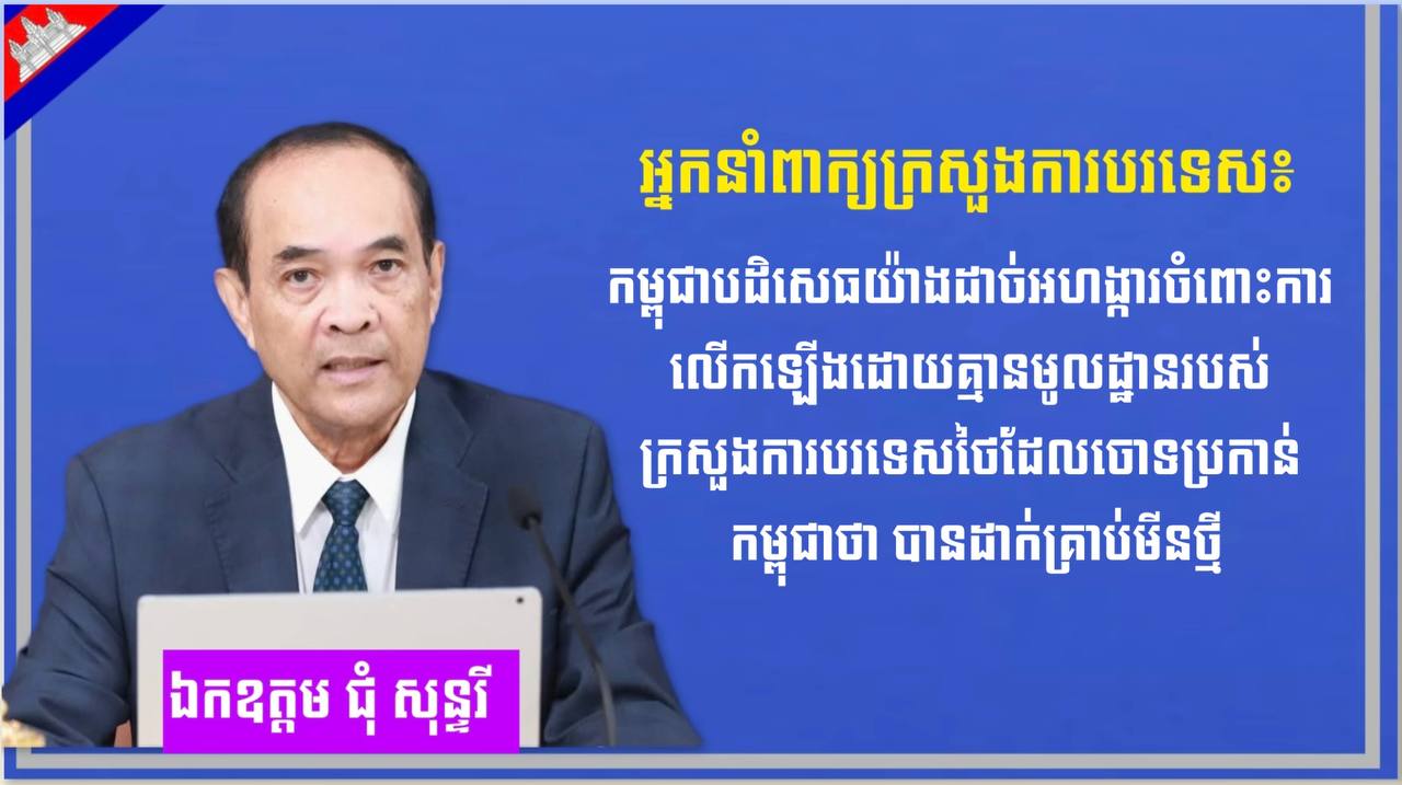 ឯកឧត្តម ជុំ សុន្ទរី អ្នកនាំពាក្យក្រសួងការបរទេសនិងសហប្រតិបត្តិការអន្តរជាតិថ្លែងក្នុងសេចក្តីសង្ខេបព័ត៌មានប្រចាំថ្ងៃស្តីពី «លទ្ធផលនៃការអនុវត្តបទឈប់បាញ់រវាងកម្ពុជា-ថៃ» នាវេលាម៉ោង ១១:០០ ព្រឹកថ្ងៃទី១១ ខែសីហា ឆ្នាំ២០២៥ បានមានប្រសាសន៍ថា ក្រសួងការបរទេសនិងសហប្រតិបត្តិការអន្តរជាតិរបស់ព្រះរាជាណាចក្រកម្ពុជាបដិសេធយ៉ាងដាច់អហង្ការដែលលើកឡើងដោយគ្មានមូលដ្ឋានរបស់ក្រសួងការបរទេសថៃកាលពីថ្ងៃទី១០ ខែសីហា ឆ្នាំ២០២៥ ចោទប្រកាន់កម្ពុជាថា បានដាក់គ្រាប់មីនថ្មី។