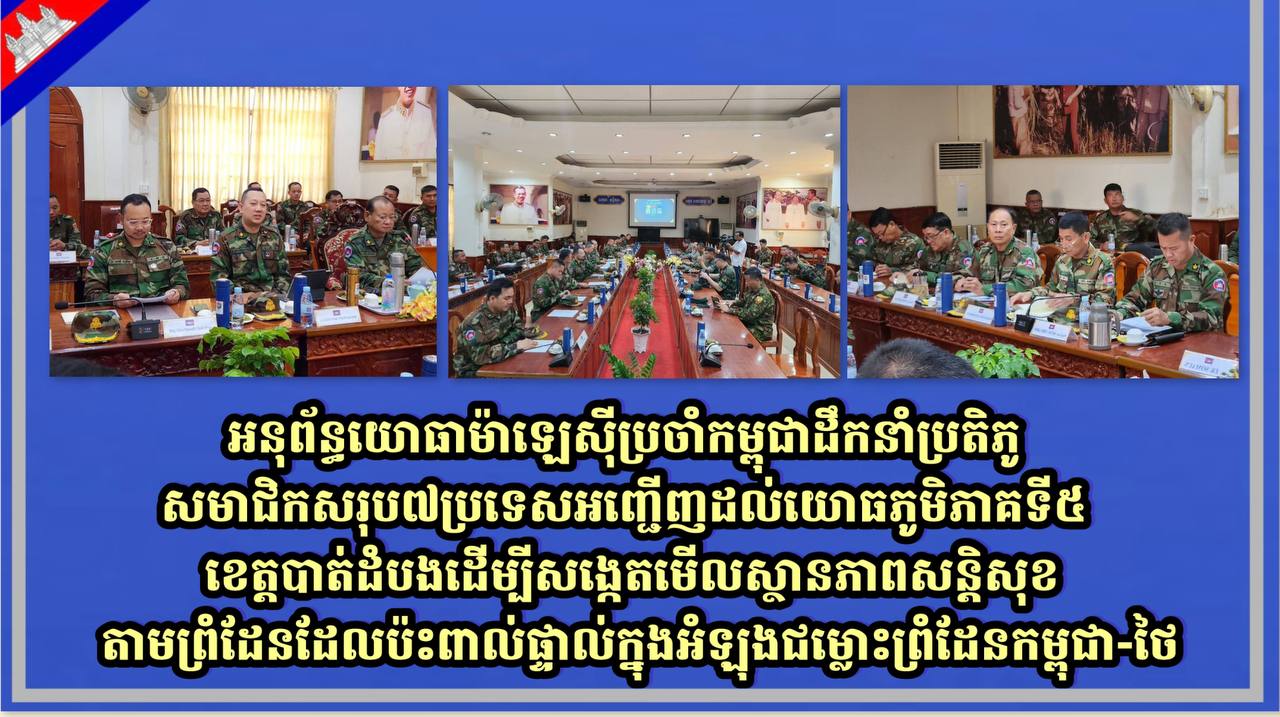 ជាមួយគ្នានេះដែរ ឯកឧត្តម ឧត្តមសេនីយ៍ឯក ឯក សំអូន មេបញ្ជាការរងកងទ័ពជើងគោក មេបញ្ជាការយោធភូមិភាគទី៥ ខេត្តបាត់ដំបង បានជម្រាបជូនប្រតិភូដែលមានសមាជិកសរុបចំនួន ៧ប្រទេសអំពីបច្ចុប្បន្នភាពស្ថានភាពព្រំដែនកម្ពុជា-ថៃ ។