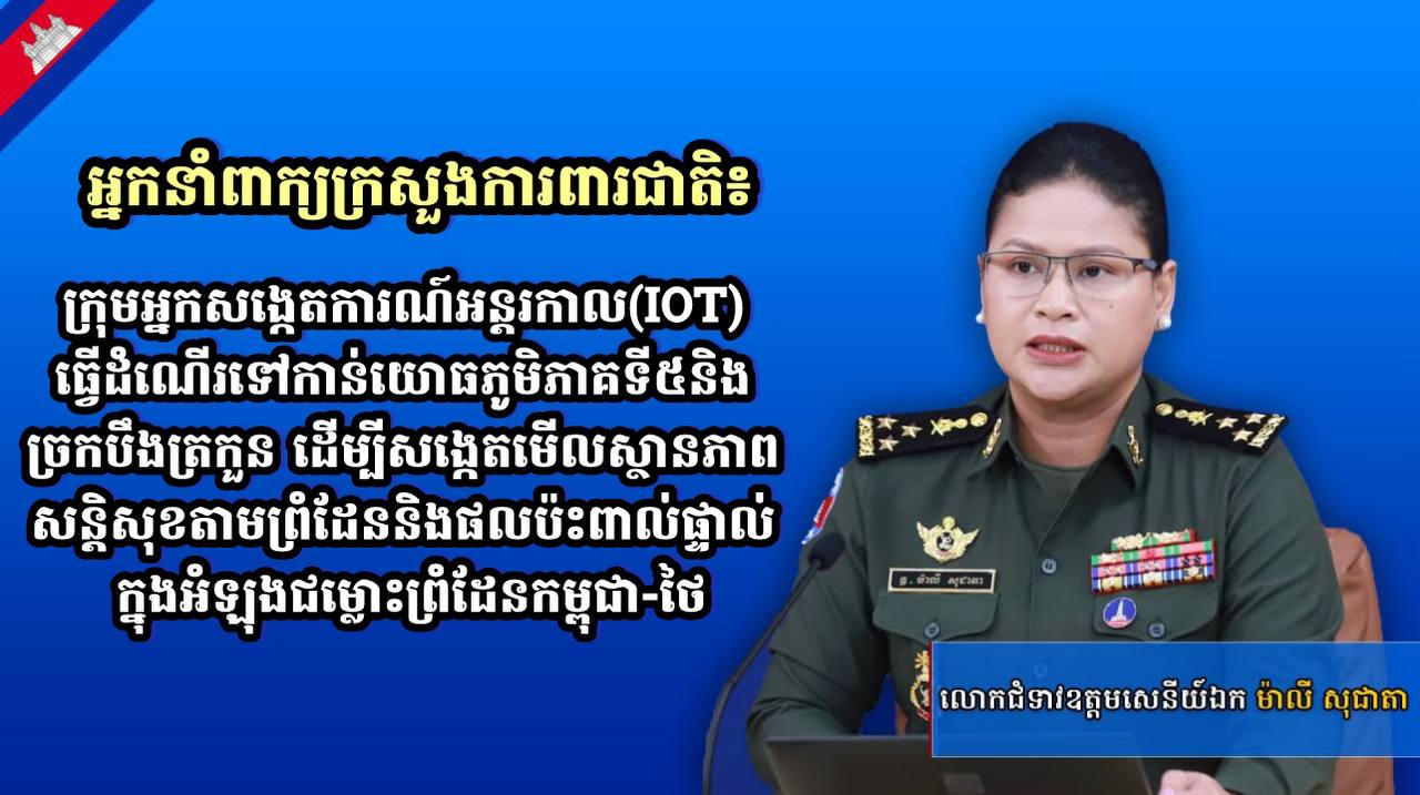នៅព្រឹកថ្ងៃទី១៤ ខែសីហា ឆ្នាំ២០២៥ លោកជំទាវឧត្តមសេនីយ៍ឯក ម៉ាលី សុជាតា អ្នកនាំពាក្យក្រសួងការពារជាតិ បានថ្លែងក្នុងសេចក្តីសង្ខេបព័ត៌មានប្រចាំថ្ងៃស្តីពី «លទ្ធផលនៃការអនុវត្តបទឈប់បាញ់រវាងកម្ពុជា-ថៃ» ថា នៅព្រឹកថ្ងៃទី១៤ នេះ ក្រុមអ្នកសង្កេតការណ៍អន្តរកាល(IOT) បានចេញដំណើរពីទីក្រុងភ្នំពេញទៅកាន់ទីតាំងដែលត្រូវចុះត្រួតពិនិត្យនៅតាមបន្ទាត់ព្រំដែន។ ដំណើរចុះពិនិត្យនេះ ដឹកនាំដោយលោកវរៈសេនីយ៍ឯក NAZLEE BIN ABDUL RAHIM អនុព័ន្ធយោធាម៉ាឡេស៊ីប្រចាំកម្ពុជា ដែលមានតំណាងមកពី៦ប្រទេសចូលរួមក្នុងនោះមាន៖ ប្រ៊ុយណេ ឥណ្ឌូនេស៊ី ឡាវ មីយ៉ាន់ម៉ា ហ្វីលីពីន និងវៀតណាម ដែលមាននិវេសនដ្ឋានក្នុង និងក្រៅប្រទេសកម្ពុជាដែលមានសមាជិកសរុបចំនួន៧ប្រទេស។