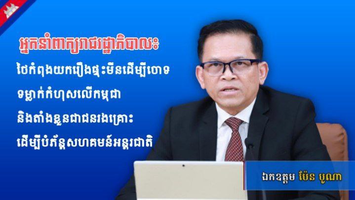 ឯកឧត្តម ប៉ែន បូណា អ្នកនាំពាក្យរាជរដ្ឋាភិបាល បានថ្លែងថា ថៃកំពុងតែយករឿងផ្ទុះគ្រាប់មីនមកធ្វើជាប្រធានបទ ដើម្បីចោទទំលាក់កំហុសលើកម្ពុជា ហើយតាំងខ្លួនជាអ្នករងគ្រោះ ដើម្បីបំភ័ន្តសហគមន៍អន្តរជាតិទាំងដែលការពិតកងទ័ពថៃខ្លួនឯងទេ ដែលចល័តកម្លាំងទ័ពដោយបំពានកិច្ចព្រមព្រៀងឈប់បាញ់ ហើយបានជាន់គ្រាប់មីនដែលនៅសល់ពីសម័យសង្គ្រាម។ ជាក់ស្តែងកងទ័ពថៃបានធ្វើសកម្មភាពពង្រាយកង់ឡាន បន្លាលួស និងចល័តសព្វាវុធ និងសកម្មភាពជាច្រើនទៀត នៅក្នុងអំឡុងពេលកម្ពុជាអនុវត្តកិច្ចព្រមព្រៀងឈប់បាញ់ដែលទាំងអស់នេះ គឺជាភស្តុតាងដែលមិនអាចប្រកែកបាន។