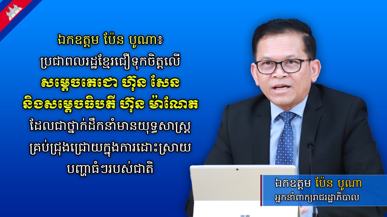 ឯកឧត្តម ប៉ែន បូណា អ្នកនាំពាក្យរាជរដ្ឋាភិបាល បានមានប្រសាសន៍ថា បងប្អូនប្រជាពលរដ្ឋខ្មែរយើងជឿជាក់ទុកចិត្តលើកថ្នាក់ដឹកនាំដោយឥតងាករេពីព្រោះយើងបានដឹងទាំងអស់គ្នាទាំងសម្តេចតេជោ ហ៊ុន សែន ប្រធានព្រឹទ្ធសភា ទាំងសម្តេចមហាបវរធិបតី ហ៊ុន ម៉ាណែត នាយករដ្ឋមន្ត្រី គឺជាថ្នាក់ដឹកនាំដែលបានបទពិសោធន៍ខ្ពស់មានយុទ្ធសាស្ត្រគ្រប់ជ្រុងជ្រោយក្នុងដោះស្រាយបញ្ហាធំៗរបស់ជាតិ។
