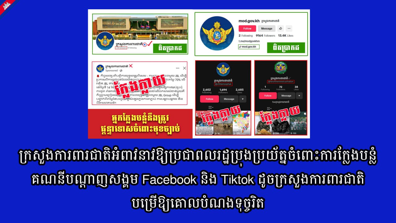 ក្រសួងការពារជាតិនៃព្រះរាជាណាចក្រកម្ពុជាតាមរយៈបណ្តាញសង្គមផ្លូវការនៅរសៀលថ្ងៃទី១៥ ខែសីហា ឆ្នាំ២០២៥បានជូនដំណឹងដល់សាធារណជនជ្រាបពីគណនីផ្លូវការ និងគណនីក្លែងក្លាយនៅលើបណ្ដាញសង្គមហ្វេសប៊ុក (Facebook) និង ទិកតុក(Tiktok) របស់ក្រសួងការពារជាតិដូចមានគូសបញ្ជាក់ដូចក្នុងរូបភាព។
