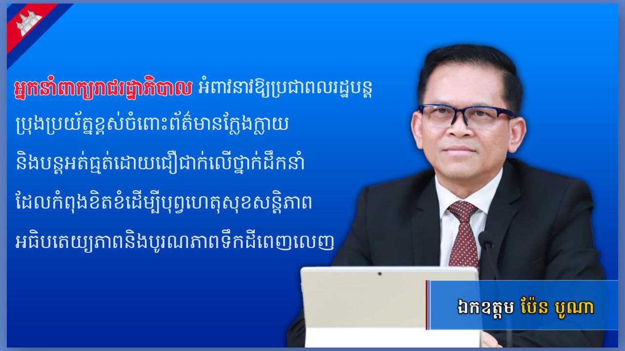 ១. សូមបងប្អូនប្រជាពលរដ្ឋខ្មែរទាំងក្នុង និងក្រៅប្រទេស បន្តប្រុងប្រយ័ត្នចំពោះព័ត៌មានក្លែងក្លាយ ដែលបានផ្សព្វផ្សាយយ៉ាងច្រើននៅក្នុងបណ្តាញសង្គម ឬពេលខ្លះតាមបណ្តាញផ្លូវការមួយចំនួនផង។ព័ត៌មានក្លែងក្លាយទាំងនោះមានគោលបំណងបង្ខូចកេរ្តិ៍ឈ្មោះថ្នាក់ដឹកនាំ បង្ខូចកេរ្តិ៍ឈ្មោះប្រទេសកម្ពុជាទាំងមូល និងញុះញង់បំបែកបំបាក់សាមគ្គីឯកភាពជាតិខ្មែរ ដែលជាខែលការពារបូរណភាពទឹកដីដ៏រឹងមាំរបស់យើង អាស្រ័យហេតុនេះសូមបងប្អូនប្រជាពលរដ្ឋទាំងអស់ រងចាំទទួលព័ត៌មានពិតពីរាជរដ្ឋាភិបាល តាមរយៈសារផ្លូវការពីថ្នាក់ដឹកនាំកំពូល និងពីក្រុមអ្នកនាំពាក្យ និងពីប្រភពផ្លូវការរបស់ក្រសួង ឬស្ថាប័នជំនាញ។