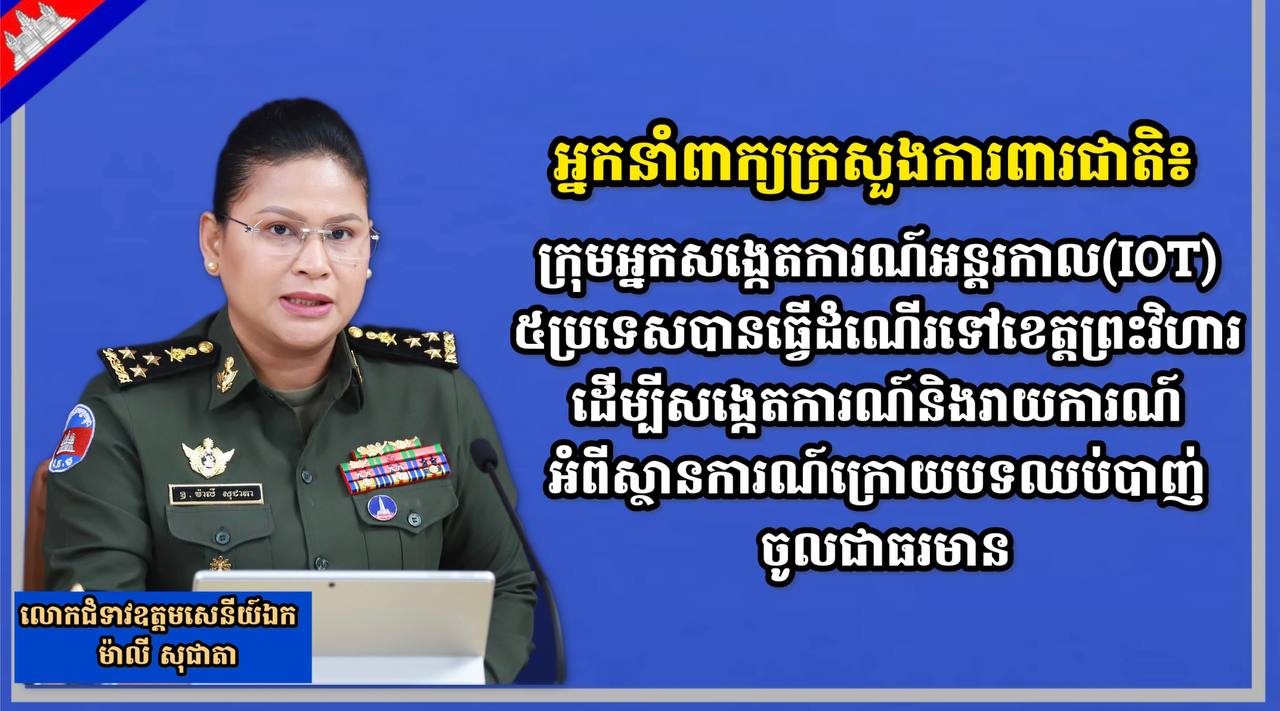 លោកជំទាវឧត្តមសេនីយ៍ឯក ម៉ាលី សុជាតា អ្នកនាំពាក្យក្រសួងការពារជាតិថ្លែងក្នុងសេចក្តីសង្ខេបព័ត៌មានប្រចាំថ្ងៃស្តីពី «លទ្ធផលនៃការអនុវត្តបទឈប់បាញ់រវាងកម្ពុជា-ថៃ» នាព្រឹកថ្ងៃទី២០ ខែសីហា ឆ្នាំ២០២៥ បានមានប្រសាសន៍ថា នៅព្រឹកនេះ ក្រសួងការពារជាតិនៃព្រះរាជាណាចក្រកម្ពុជាបានសម្របសម្រួលជូនក្រុមអ្នកសង្កេតការណ៍អន្តរកាល(IOT) ដែលមានតំណាងមកពីប្រទេសចំនួន ៥ដឹកនាំដោយវរសេនីយ៍ឯក NAZLEE BIN ABDUL RAHIM អនុព័ន្ធយោធាម៉ាឡេស៊ីប្រចាំកម្ពុជាបានចេញដំណើរពីរាជធានីភ្នំពេញឆ្ពោះទៅខេត្តព្រះវិហារដើម្បីសង្កេតការណ៍ផ្ទៀងផ្ទាត់ និងរាយការណ៍អំពីស្ថានការណ៍ក្រោយបទឈប់បាញ់ចូលជាធរមាន។