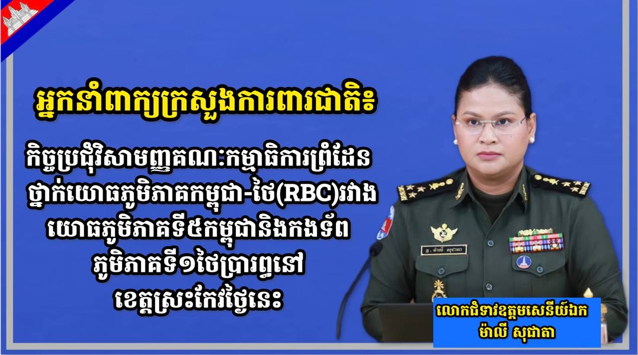 លោកជំទាវឧត្តមសេនីយ៍ឯក ម៉ាលី សុជាតា អ្នកនាំពាក្យក្រសួងការពារជាតិថ្លែងក្នុងសេចក្តីសង្ខេបព័ត៌មានប្រចាំថ្ងៃស្តីពី «លទ្ធផលនៃការអនុវត្តបទឈប់បាញ់រវាងកម្ពុជា-ថៃ» នាព្រឹកថ្ងៃទី២២ ខែសីហា ឆ្នាំ២០២៥ បានមានប្រសាសន៍ថា នៅថ្ងៃទី២១ ខែសីហា ឆ្នាំ២០២៥ កិច្ចប្រជុំក្រុមលេខាធិការដ្ឋាននៃគណៈកម្មាធិការព្រំដែនថ្នាក់យោធភូមិភាគកម្ពុជា-ថៃ(RBC) រវាងយោធភូមិភាគទី៥របស់កម្ពុជានិងកងទ័ពភូមិភាគទី១ថៃបានដំណើរការកិច្ចប្រជុំរបស់ខ្លួនពេញមួយថ្ងៃដោយភាគីទាំងពីរបានឯកភាពអំពីដំណើរការនៃកិច្ចប្រជុំមួយផ្នែកតាមប្រព័ន្ធបច្ចេកវិទ្យាអនឡាញ ហើយជាលទ្ធផលកិច្ចប្រជុំក្រុមលេខាបានប្រព្រឹត្តទៅដោយមានភាពរីកចម្រើនជាវិជ្ជមានមួយចំនួនគួរអោយកត់សម្គាល់ក្រោយពេលជួបពិភាក្សាគ្នាដើម្បីត្រៀមសម្រាប់កិច្ចប្រជុំវិសាមញ្ញគណៈកម្មាធិការព្រំដែនថ្នាក់យោធភូមិភាគកម្ពុជា-ថៃ(RBC) នៅថ្ងៃនេះ។