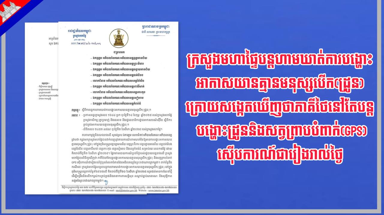 ក្រសួងមហាផ្ទៃនៃព្រះរាជាណាចក្រកម្ពុជា បានសម្រេចបន្តហាមឃាត់ការបង្ហោះអាកាសយានគ្មានមនុស្សបើក(ដ្រូន) បន្ទាប់ពីបានពិនិត្យឃើញថា ភាគីថៃនៅតែបន្តបង្ហោះអាកាសយានគ្មានមនុស្សបើក(ដ្រូន) និងសត្វព្រាបបំពាក់ GPS ស៊ើបការណ៍ជារៀងរាល់ថ្ងៃចូលរំលោភបំពានដែនអធិបតេយ្យនៃព្រះរាជាណាចក្រកម្ពុជា។ នេះបើយោងតាមលិខិតរបស់ក្រសួងមហាផ្ទៃផ្ញើជូនអភិបាលខេត្តជាប់ព្រំដែនថៃ ចុះថ្ងៃទី២០ ខែសីហា ឆ្នាំ២០២៥។