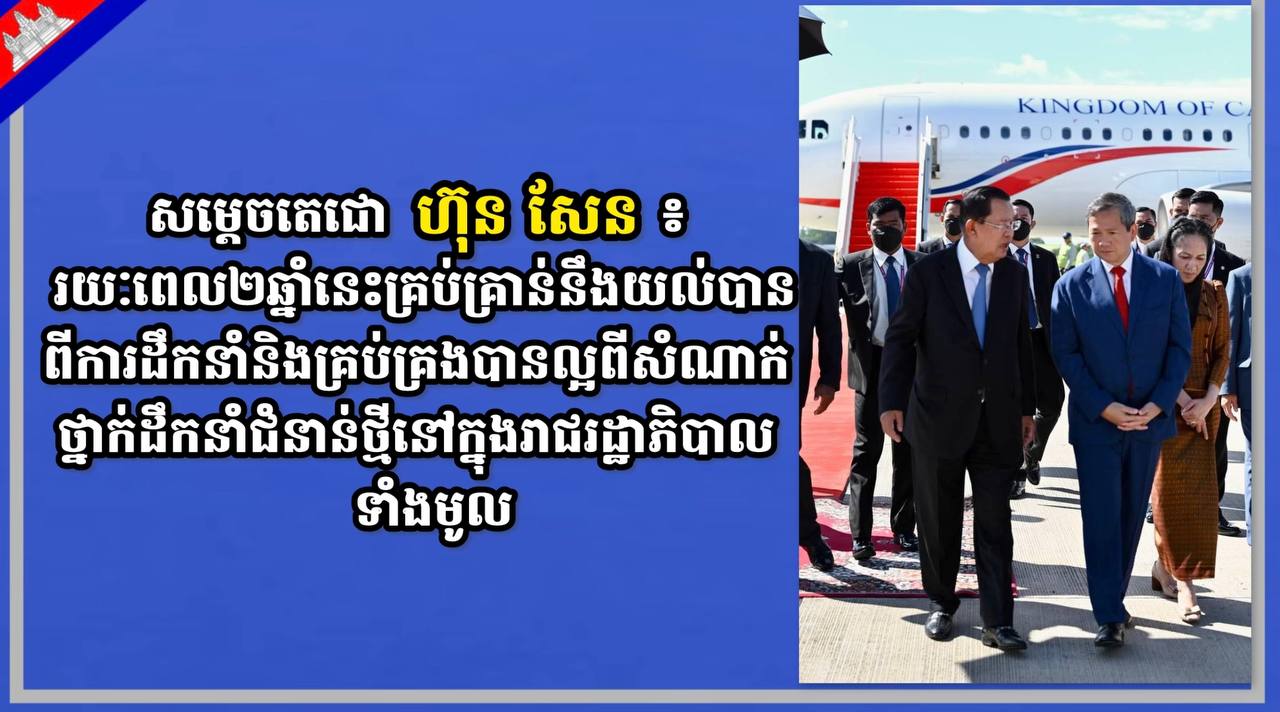 សម្តេចតេជោ ហ៊ុន សែន បានគូសរំលេចថា ២ឆ្នាំគ្រប់គ្រាន់និងយល់បានពីការដឹកនាំនិងគ្រប់គ្រងបានល្អពីសំណាក់ថ្នាក់ដឹកនាំជំនាន់ថ្មីលើគ្រប់វិស័យទាំងនៅក្នុងរាជរដ្ឋាភិបាលទាំងមូលទាំងនៅគ្រប់ស្ថាប័ន ថ្នាក់ជាតិនិងថ្នាក់ក្រោមជាតិ៕