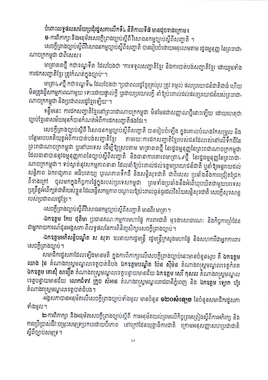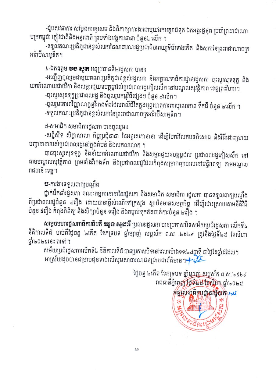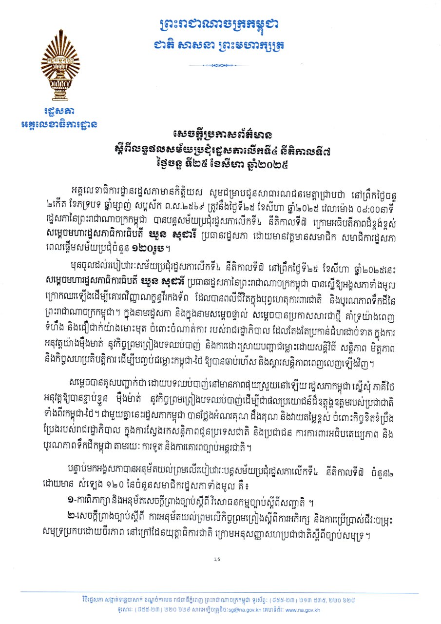 (ភ្នំេញ)៖ រដ្ឋសភា នៅថ្ងៃទី២៥ ខែសីហា ឆ្នាំ២០២៥នេះ បានចេញសេចក្ដីប្រកាសព័ត៌មាន ស្ដីពីលទ្ធផលសម័យប្រជុំរដ្ឋសភាលើកទី៤ នីតិកាលទី៧។ កិច្ចប្រជុំនេះបានធ្វើឡើងក្រោមអធិបតីភាព សម្តេចមហារដ្ឋសភាធិការធិបតី ឃួន សុដារី ប្រធានរដ្ឋសភា និងវត្តមានសមាជិក សមាជិករដ្ឋសភាចំនួន ១២០រូប៕