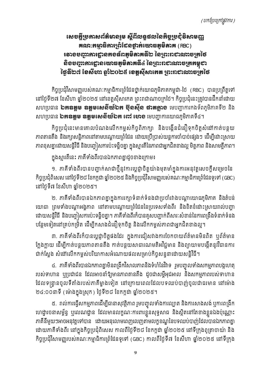 សេចក្តីប្រកាសព័ត៌មានរួម ស្ដីពីលទ្ធផលនៃកិច្ចប្រជុំវិសាមញ្ញគណៈកម្មាធិការព្រំដែនថ្នាក់យោធភូមិភាគ (RBC) រវាងយោធភូមិភាគទី៤របស់កម្ពុជា និងកងទ័ពភូមិភាគទី២របស់ថៃ នៅថ្ងៃទី២៧ ខែសីហា ឆ្នាំ២០២៥ ដោយភាគីថៃធ្វើជាម្ចាស់ផ្ទះ។