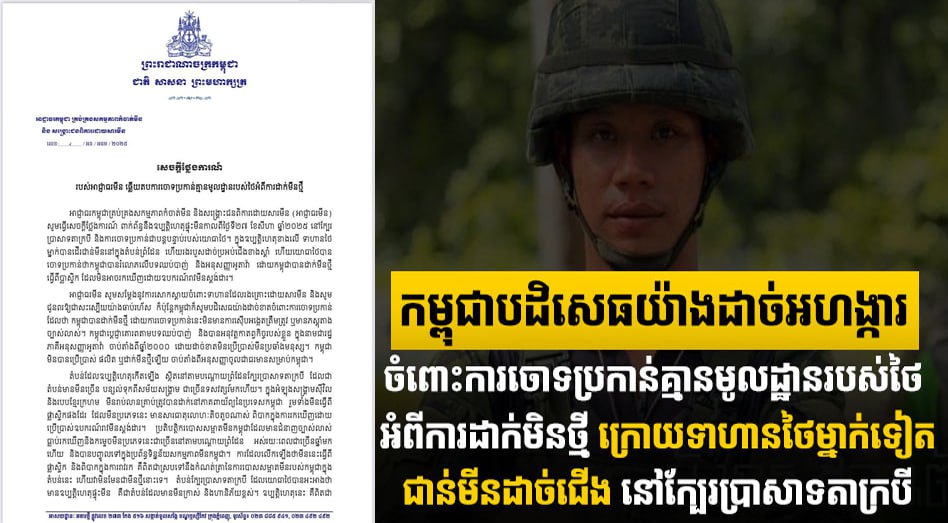 កម្ពុជាបដិសេធយ៉ាងដាច់អហង្ការ ចំពោះការចោទប្រកាន់គ្មានមូលដ្ឋានរបស់ថៃ អំពីការដាក់មីនថ្មី ក្រោយទាហានថៃម្នាក់ទៀតជាន់មីនដាច់ជើង នៅក្បែរប្រាសាទតាក្របី