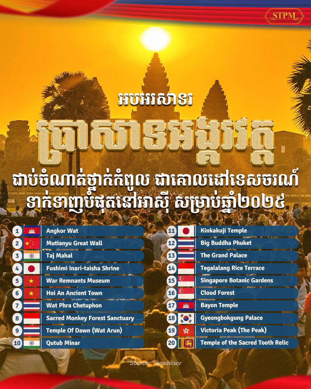 ភ្នំពេញ ថ្ងៃទី៣០ ខែសីហា ឆ្នាំ២០២៥–ប្រាសាទអង្គរវត្ត ដែលជានិមិត្តរូបនៃព្រះរាជាណាចក្រកម្ពុជា បានជាប់ចំណាត់ថ្នាក់កំពូលថាជាគោលដៅទេសចរណ៍ដ៏ទាក់ទាញបំផុតនៅអាស៊ី សម្រាប់ឆ្នាំ២០២៥ ដោយឈរនៅលើ មហាកំផែងរបស់ប្រទេសចិន និងប្រាសាទ Taj Mahal របស់ប្រទេសឥណ្ឌា។ នេះបើតាមគេហទំព័រទេសចរណ៍ដ៏ល្បីល្បាញ Tripadvisor ចេញផ្សាយកាលពីពេលថ្មីៗនេះ។
