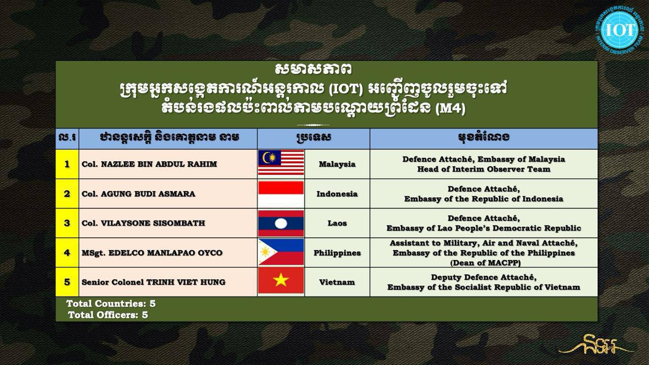 គួរបញ្ជាក់ផងដែរថា បេសកកម្មរបស់ក្រុមអ្នកសង្កេតការណ៍ អន្តរកាល (IOT) ខាងលើនេះគឺ បានកើតចេញពីលទ្ធផលនៃកិច្ចប្រជុំពិសេស ដែលបានធ្វើឡើងនៅថ្ងៃទី២៨ ខែកក្កដា ឆ្នាំ២០២៥ នៅទីក្រុងពូត្រាយៃយ៉ា ប្រទេសម៉ាឡេស៊ី និងកិច្ចប្រជុំវិសាមញ្ញ នៃគណៈកម្មាធិការព្រំដែនទូទៅកម្ពុជា-ថៃ (GBC) ដែលបានបញ្ចប់កាលពីថ្ងៃទី៧ ខែសីហា ឆ្នាំ២០២៥ កន្លងទៅ។