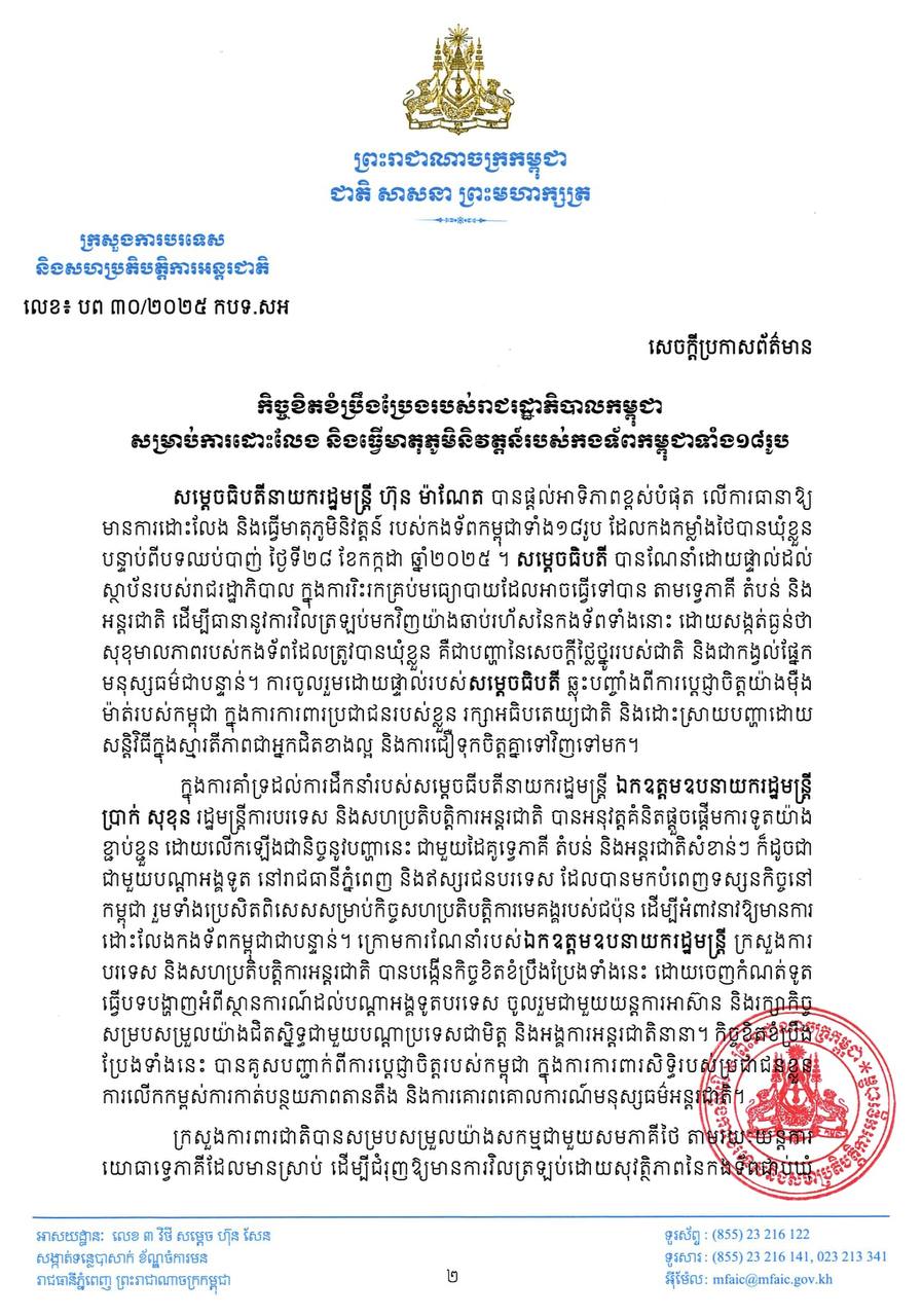 សេចក្ដីប្រកាសព័ត៌មានរបស់ក្រសួងការបរទេស និងសហប្រតិបត្តិការអន្តរជាតិ ស្ដីពី កិច្ចខិតខំប្រឹងប្រែងរបស់រាជរដ្ឋាភិបាលកម្ពុជា សម្រាប់ការដោះលែង និងធ្វើមាតុភូមិនិវត្តន៍របស់កងទ័ពកម្ពុជាទាំង១៨រូប