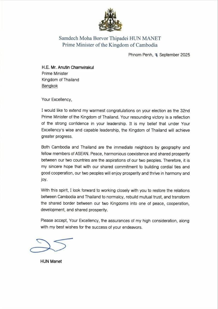 ភ្លាមៗក្រោយពីលោក Anutin Charnvirakul ត្រូវបានព្រះមហាក្សត្រថៃតែងតាំងជានាយករដ្ឋមន្ត្រីថ្មីនៃប្រទេសនេះ សម្ដេចធិបតី ហ៊ុន ម៉ាណែត នៅរសៀលថ្ងៃទី៧ ខែកញ្ញា ឆ្នាំ២០២៥ បានផ្ញើលិខិតអបអរសាទរដល់លោក Anutin ដោយគូសបញ្ជាក់ថា សម្ដេចទន្ទឹងរង់ចាំធ្វើការយ៉ាងជិតស្និទ្ធជាមួយលោក Anutin ដើម្បីស្តារទំនាក់ទំនងរវាងកម្ពុជានិងថៃឱ្យមានភាពប្រក្រតីឡើងវិញ កសាងនូវទំនុកចិត្តជាមួយគ្នាទៅវិញទៅមក និងប្រែក្លាយព្រំដែនរួមរវាងព្រះរាជាណាចក្រទាំងពីរឱ្យទៅជាព្រំដែនសន្តិភាព កិច្ចសហប្រតិបត្តិការ ការអភិវឌ្ឍ និងវិបុលភាពរួមគ្នា។