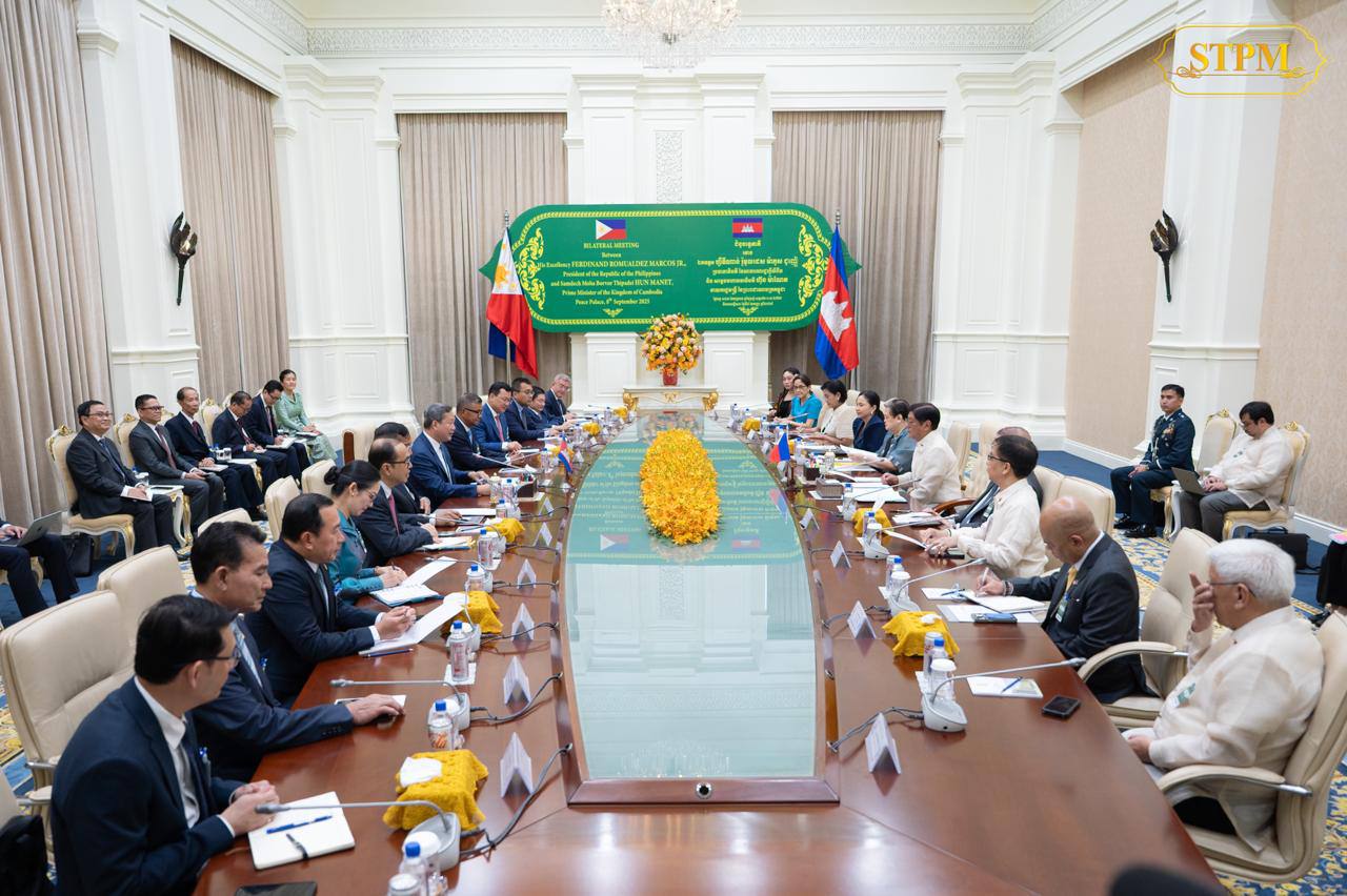 នាព្រឹកថ្ងៃទី៨ ខែកញ្ញា ឆ្នាំ២០២៥, នៅវិមានសន្តិភាព, សម្តេចមហាបវរធិបតី ហ៊ុន ម៉ាណែត នាយករដ្ឋមន្រ្តី នៃព្រះរាជាណាចក្រកម្ពុជា បានជួបពិភាក្សាការងារទ្វេភាគី ជាមួយឯកឧត្តម ហ្វឺឌីណាន់ រ៉ូម៉ូលដេស ម៉ាកូស ជូញៀ (Ferdinand Romualdez Marcos Jr.) ប្រធានាធិបតី នៃសាធារណរដ្ឋហ្វីលីពីន និងគណៈប្រតិភូជាន់ខ្ពស់ ក្នុងដំណើរទស្សនកិច្ចផ្លូវរដ្ឋ នៅព្រះរាជាណាចក្រកម្ពុជា ពីថ្ងៃទី៧ ដល់ថ្ងៃទី៩ ខែកញ្ញា ឆ្នាំ២០២៥ ។