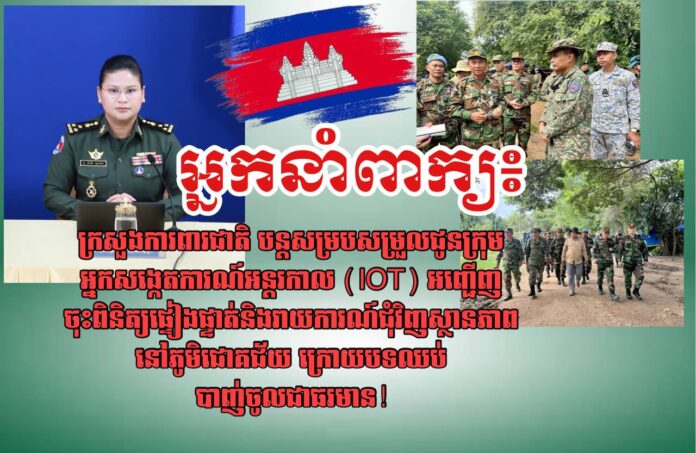អ្នកនាំពាក្យ៖ ក្រសួងការពារជាតិ បន្តសម្របសម្រួលជូនក្រុមអ្នកសង្កេតការណ៍អន្តរកាល (IOT) អញ្ជើញចុះពិនិត្យ ផ្ទៀងផ្ទាត់និងរាយការណ៍ជុំវិញស្ថានភាពនៅភូមិជោគជ័យ ក្រោយបទឈប់បាញ់ចូលជាធរមាន!