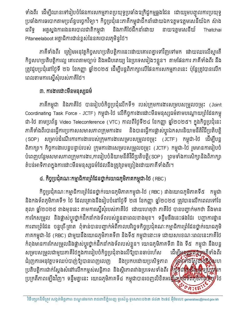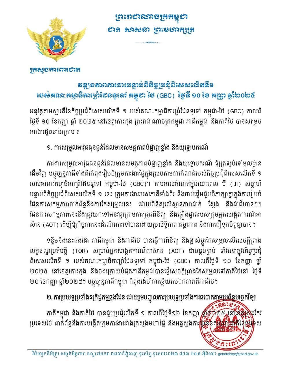អនុវត្តតាមស្មារតីនៃកិច្ចប្រជុំពិសេសលើកទី ១ របស់គណៈកម្មាធិការព្រំដែនទូទៅ កម្ពុជា-ថៃ (GBC) កាលពីថ្ងៃទី ១០ ខែកញ្ញា ឆ្នាំ ២០២៥ នៅខេត្តកោះកុង ព្រះរាជាណាចក្រកម្ពុជា ភាគីកម្ពុជា និងភាគីថៃ បានសម្រេចការងារដូចខាងក្រោម ៖