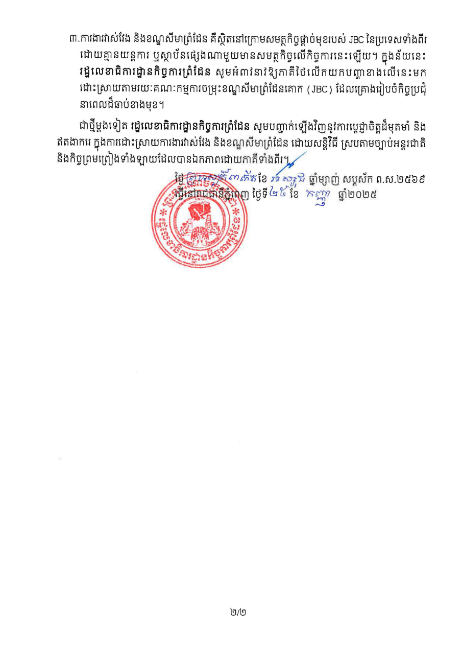 ២.សកម្មភាពឯកតោភាគីខាងលើ គឺជាការបង្កហេតុ ដែលអាចនាំឱ្យមានភាពតានតឹងកើនឡើងនៅតាមព្រំដែន និងជាការបំពានលើកិច្ចព្រមព្រៀងបទឈប់បាញ់ ថ្ងៃទី២៨ ខែកក្កដា ឆ្នាំ ២០២៥, លទ្ធផលនៃកិច្ចប្រជុំវិសាមញ្ញរបស់គណៈកម្មាធិការព្រំដែនទូទៅ (GBC) ថ្ងៃទី៧ ខែសីហា ឆ្នាំ២០២៥ និង
