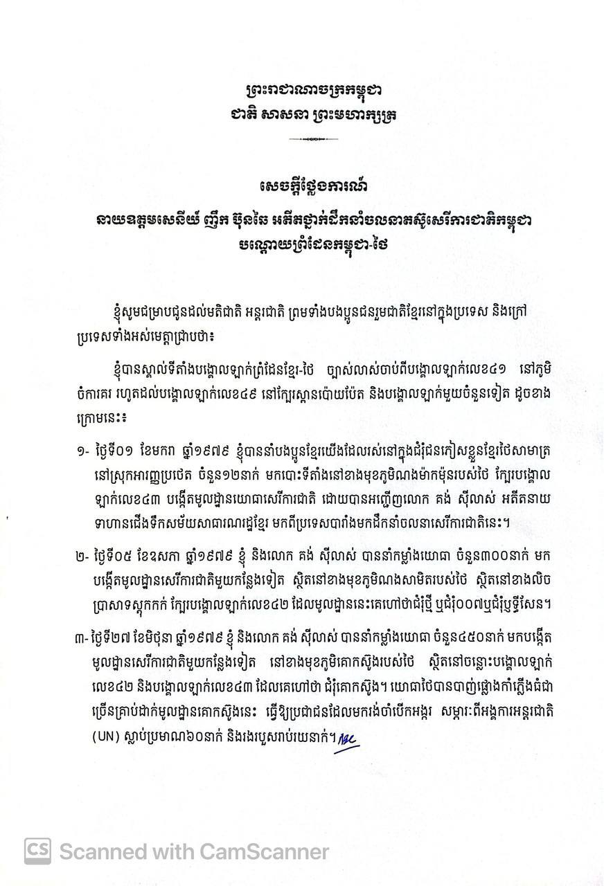 នាយឧត្តមសេនីយ៍ ញឹក ប៊ុនឆៃ ចេញសេចក្តីថ្លែងការណ៍ បញ្ជាក់ច្បាស់អំពីបញ្ហាទីតាំងបង្គោលឡាក់ព្រំដែនខ្មែរ-ថៃ