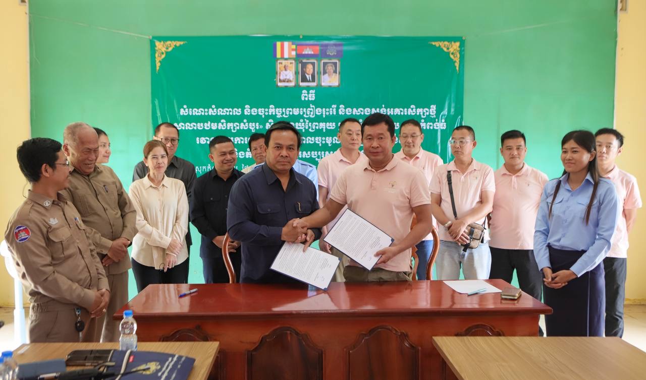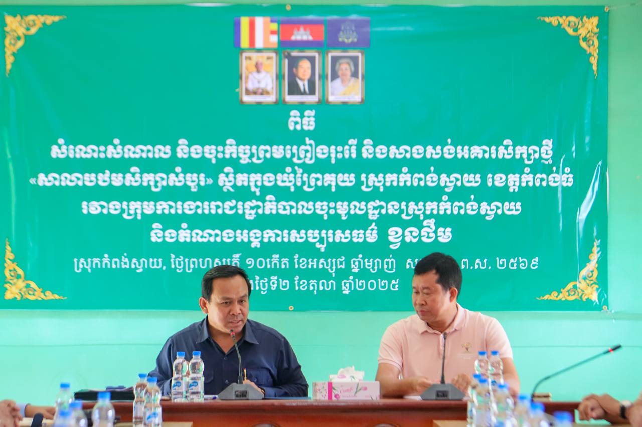 នៅព្រឹកថ្ងៃទី២ ខែតុលា ឆ្នាំ២០២៥នេះ នៅរដ្ឋបាលស្រុកកំពង់ស្វាយ ខេត្តកំពង់ធំ ឯកឧត្តម ទិត សុធា រដ្ឋលេខាធិការទីស្តីការគណៈរដ្ឋមន្ត្រី ប្រធានអង្គភាពព័ត៌មាននិងប្រតិកម្មរហ័ស និងជាប្រធានក្រុមការងាររាជរដ្ឋាភិបាលចុះមូលដ្ឋានស្រុកកំពង់ស្វាយ បានអញ្ជើញជាអធិបតីភាពក្នុងពិធីសំណេះសំណាល និងចុះកិច្ចព្រមព្រៀង ជាមួយលោក អ៊ុង គង្គា ស្ថាបនិកអង្គការសប្បុរសធម៌ខ្វនថឹម ក្នុងការរុះរើ និងសាងសង់អគារសិក្សាថ្មី១ខ្នង មានចំនួន៦បន្ទប់ ស្ថិតនៅសាលាបឋមសិក្សាសំបួរ ក្នុងភូមិសំបួរ ឃុំព្រៃ គុយ ស្រុកកំពង់ស្វាយ ខេត្តកំពង់ធំ។