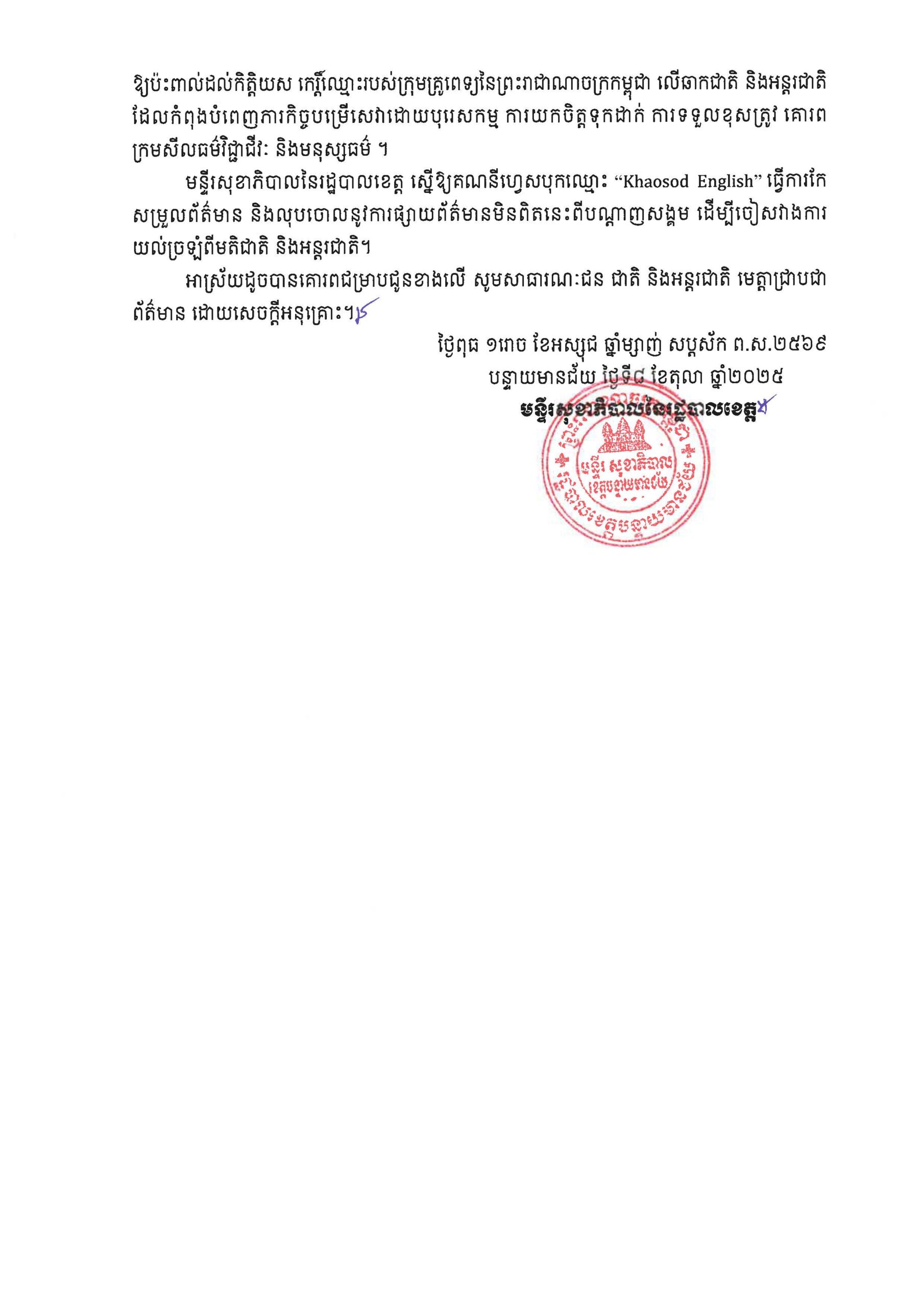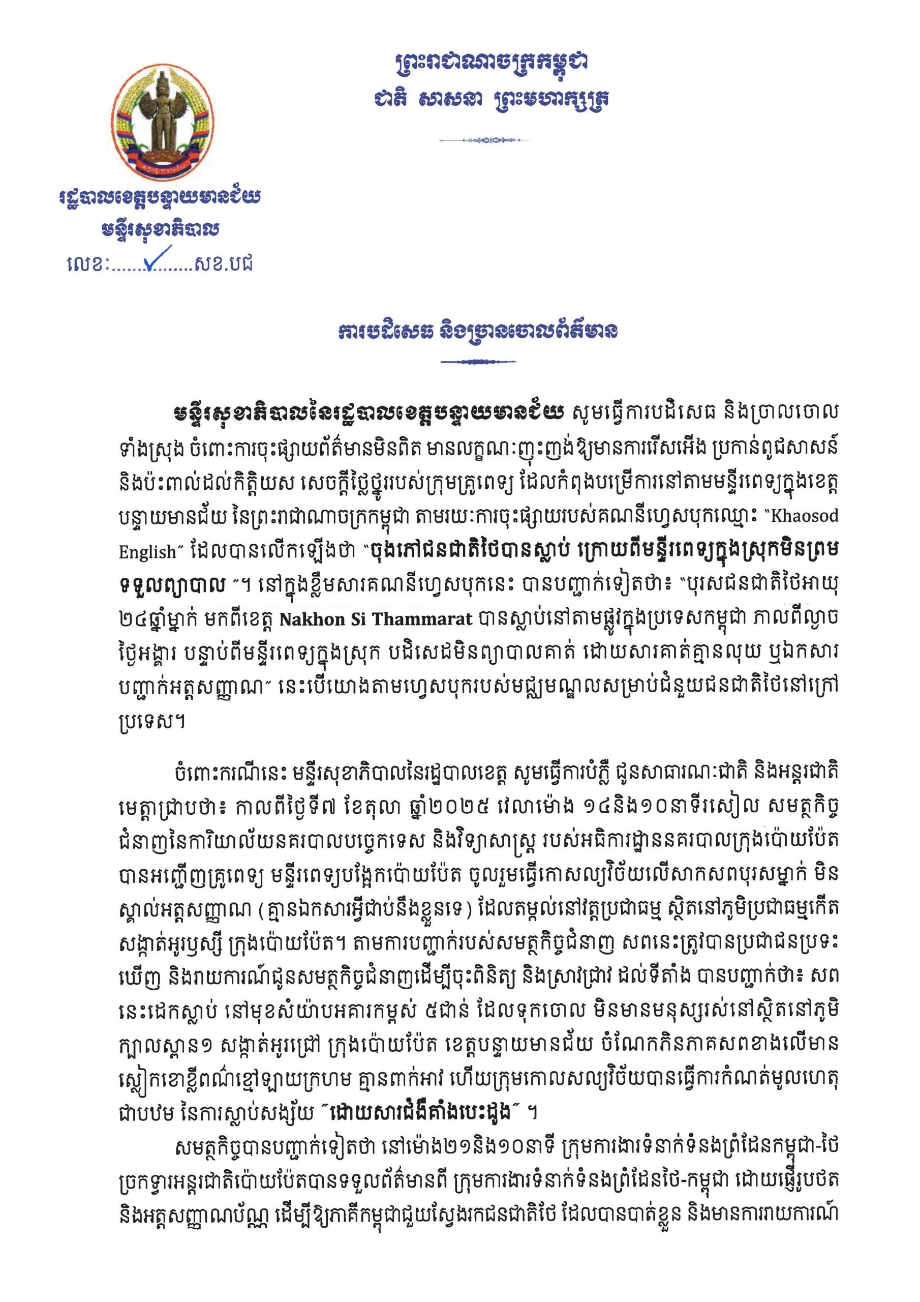 នៅថ្ងៃទី៨ ខែតុលា ឆ្នាំ២០២៥ រដ្ឋបាលខេត្តបន្ទាយមានជ័យ ចេញលិខិតបដិសេធ និងចោលចោលទាំងស្រុង ចំពោះការចុះផ្សាយព័ត៌មានមិនពិត មានលក្ខណៈញុះញង់ឱ្យមានការរើសអើង ប្រកាន់ពូជសាសន៍ និងប៉ះពាល់ដល់កិត្តិយស សេចក្តីថ្លៃថ្នូររបស់ក្រុមគ្រូពេទ្យ ដែលកំពុងបម្រើការនៅតាមមន្ទីរពេទ្យក្នុងខេត្តបន្ទាយមានជ័យ នៃព្រះរាជាណាចក្រកម្ពុជា តាមរយៈការចុះផ្សាយរបស់គណនីហ្វេសប៊ុកឈ្មោះ Khaosod Englishដែលបានលើកឡើងថា ចុងភៅជនជាតិថៃបានស្លាប់ ក្រោយពីមន្ទីរពេទ្យក្នុងស្រុកមិនព្រមទទួលព្យាបាល។