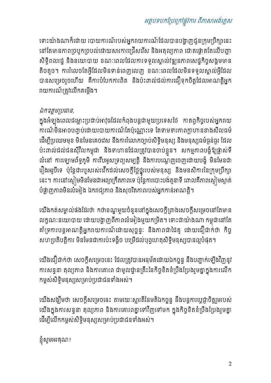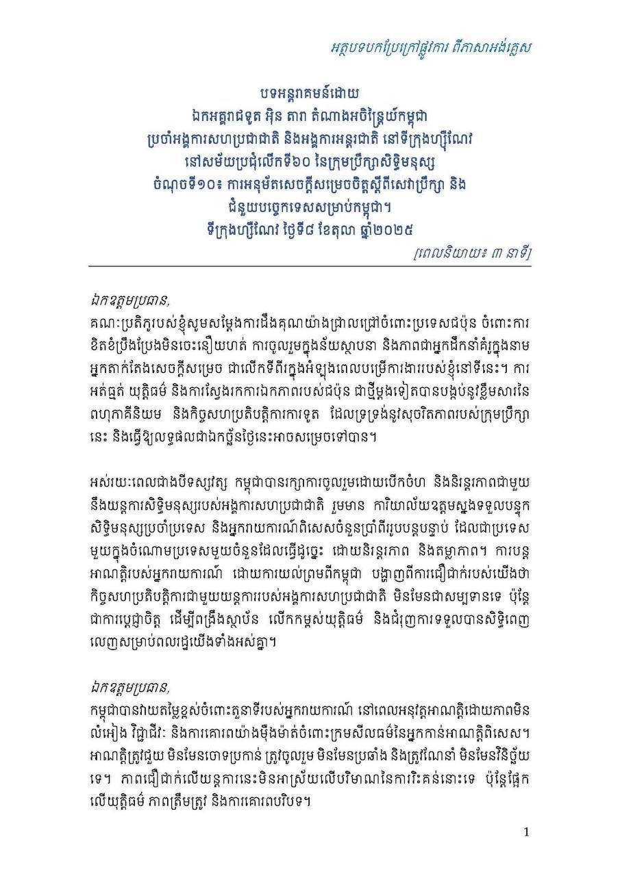 ដោយឯកអគ្គរាជទូត អ៉ិន តារា តំណាងអចិន្ត្រៃយ៍កម្ពុជា ប្រចាំអង្គការសហប្រជាជាតិ និងអង្គការអន្តរជាតិ នៅទីក្រុងហ្ស៊ឺណែវ នៅសម័យប្រជុំលើកទី៦០ នៃក្រុមប្រឹក្សាសិទ្ធិមនុស្ស