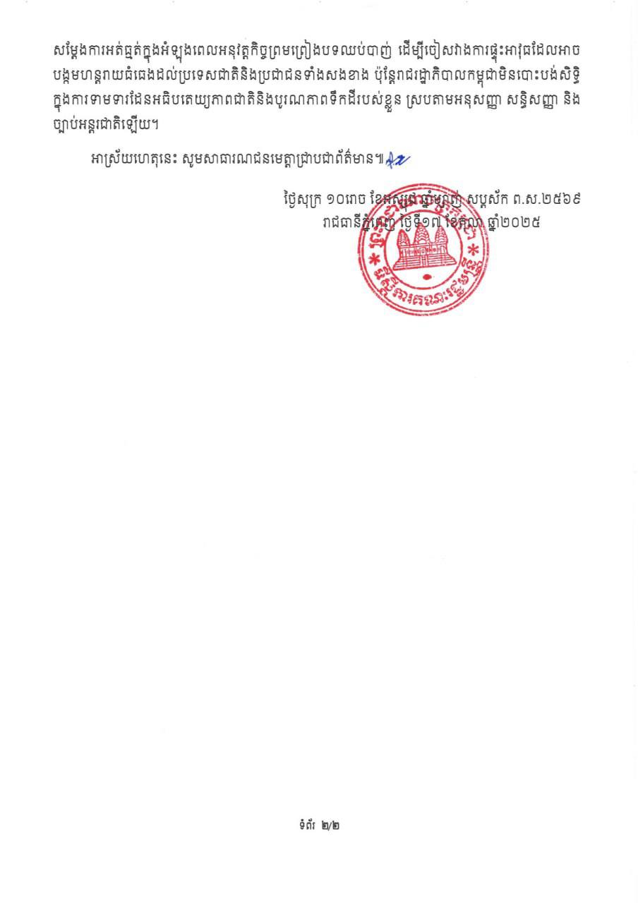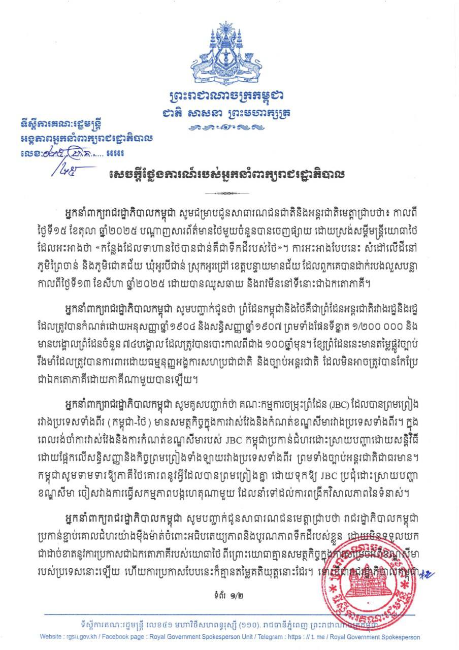 សេចក្តីថ្លែងការណ៍របស់អ្នកនាំពាក្យរាជរដ្ឋាភិបាល ទាក់ទងទៅនឹងបណ្តាញសារព័ត៌មានថៃមួយចំនួន ចេញផ្សាយកាលពីថ្ងៃទី១៥ ខែតុលា ដោយស្រង់សម្តីមន្ត្រីយោធាថៃ ដែលអះអាងថា «កន្លែងដែលទាហានថៃបានជាន់គឺជាទឹកដីរបស់ថៃ»។ ការអះអាងបែបនេះ សំដៅលើដីនៅ ភូមិព្រៃចាន់ និងភូមិជោគជ័យ ឃុំអូរបីជាន់ ស្រុកអូរជ្រៅ ខេត្តបន្ទាយមានជ័យ ដែលពួកគេបានដាក់របងលួសបន្លា កាលពីថ្ងៃទី១៣ ខែសីហា ឆ្នាំ២០២៥ ដោយបានឈូសឆាយ និងរាវមីននៅទីនោះជាឯកតោភាគី