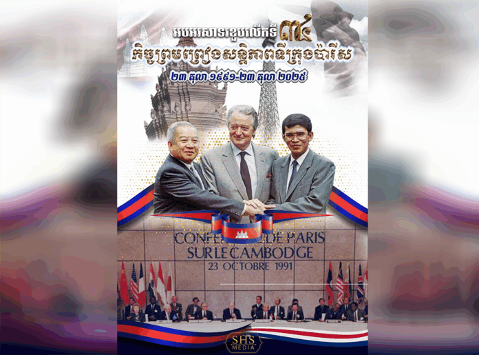៣៤ឆ្នាំមុន ពោលគឺនៅថ្ងៃទី ២៣ ខែតុលា ឆ្នាំ ១៩៩១ ភាគីទាំង ៤ របស់កម្ពុជារួមមាន៖ សម្តេចតេជោ ហ៊ុន សែន តំណាងឱ្យរដ្ឋាភិបាលកម្ពុជា ចលនាតស៊ូហ៊្វុនស៊ិនប៉ិច ដែលតំណាងដោយសម្តេចព្រះ នរោត្តម សីហនុ និងសម្តេចក្រុមព្រះ នរោត្តម រណឫទ្ធិ រណសិរ្សជាតិរំដោះប្រជាពលរដ្ឋខ្មែរ ដែលតំណាងដោយ លោក សឺន សាន និង ក្រុមចលនាកម្ពុជាប្រជាធិបតេយ្យ តំណាងដោយ លោក ខៀវ សំផន បានឈានទៅចុះហត្ថលេខា លើកិច្ចព្រមព្រៀងសន្តិភាព នៅទីក្រុងប៉ារីស ប្រទេសបារាំង ក្រោមវត្តមានសាក្សីមកពី ១៨ប្រទេស រួមទាំងអគ្គលេខាធិការអង្គការសហប្រជាជាតិ (UN) ផងដែរ ដើម្បីបញ្ចប់សង្គ្រាមស៊ីវិលនៅកម្ពុជា។
