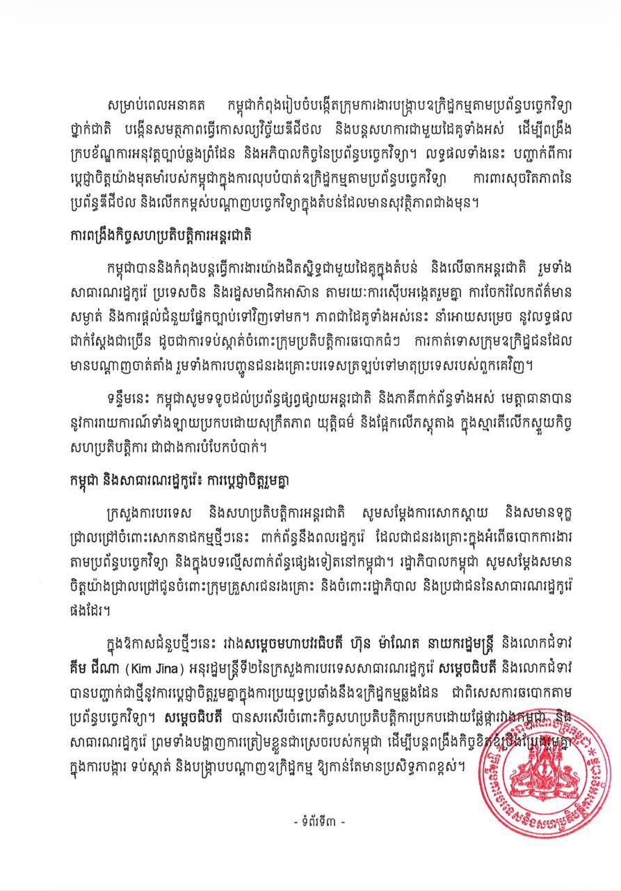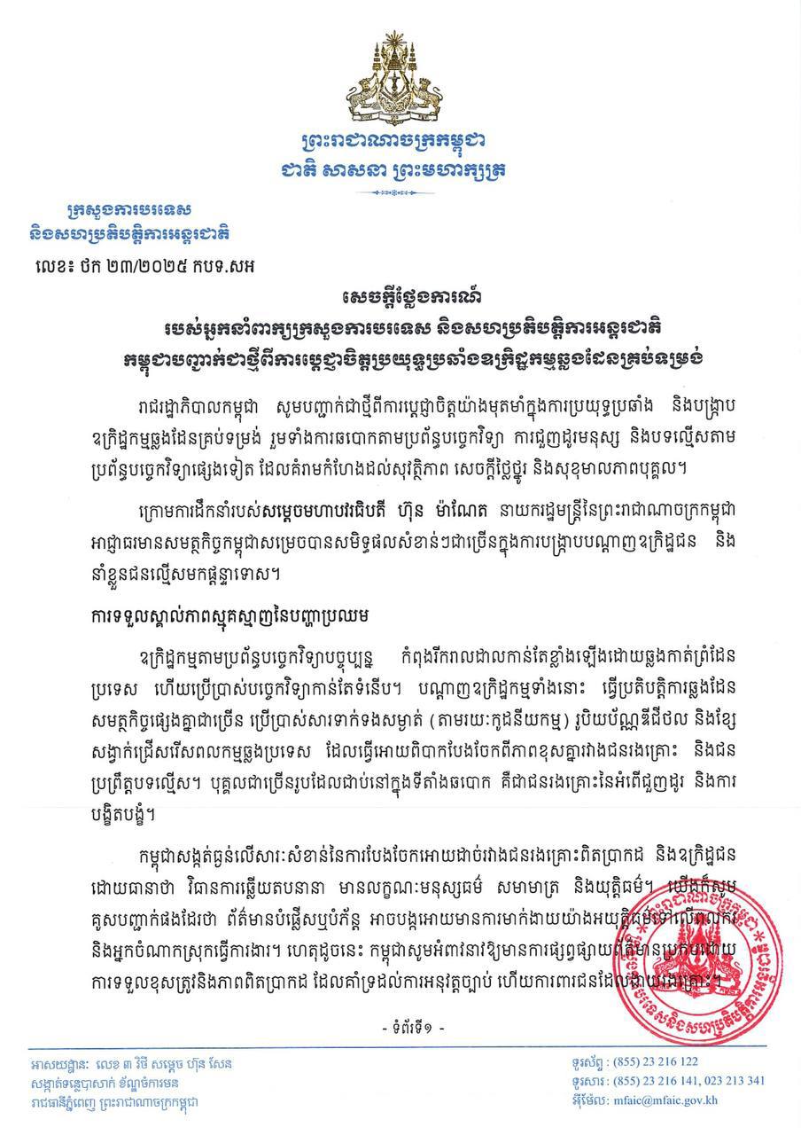 សេចក្តីថ្លែងការណ៍ របស់អ្នកនាំពាក្យក្រសួងការបរទេស និងសហប្រតិបត្តិការអន្តរជាតិ កម្ពុជាបញ្ជាក់ជាថ្មីពីការប្តេជ្ញាចិត្តប្រយុទ្ធប្រឆាំង ឧក្រិដ្ឋកម្មឆ្លងដែនគ្រប់ទម្រង់