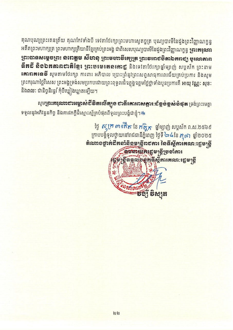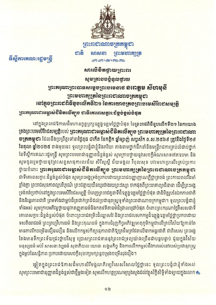 សារលិខិតថ្វាយព្រះពរ ព្រះករុណាព្រះបាទសម្តេចព្រះបរមនាថ នរោត្តម សីហមុនី ព្រះមហាក្សត្រនៃព្រះរាជាណាចក្រកម្ពុជា នៅក្នុងព្រះរាជឱកាសពិធីខួបលើកទី២១ នៃការយាងគ្រងព្រះបរមសិរីរាជសម្បត្តិ