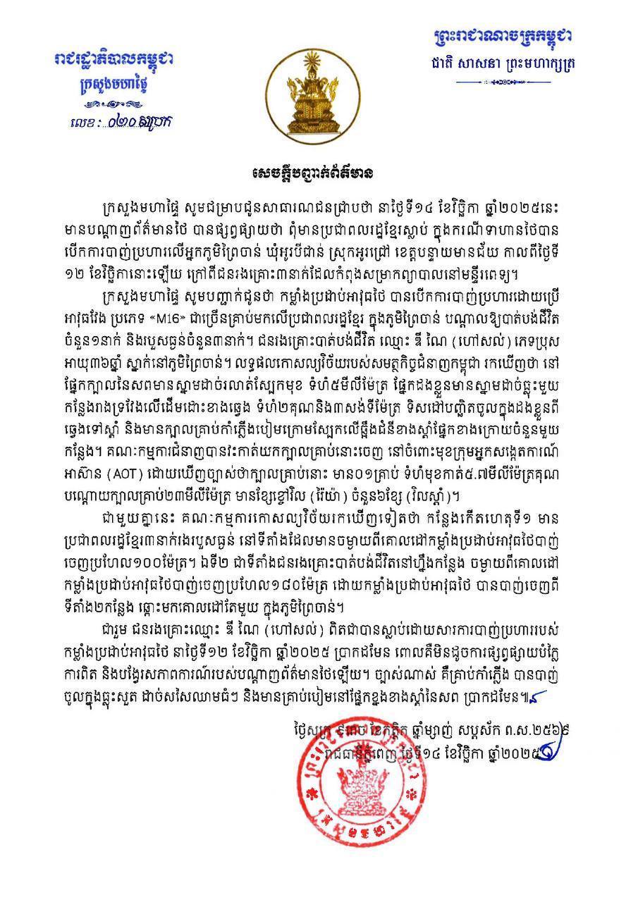 ក្រសួងមហាផ្ទៃ | សេចក្តីបញ្ជាក់ព័ត៌មាន ចំពោះបណ្តាញសារព័ត៌មានថៃ ដែលបានផ្សព្វផ្សាយថា ពុំមានប្រជាពលរដ្ឋខ្មែរ ស្លាប់ ក្នុងករណីយោធាថៃ បាញ់ប្រហារលើអ្នកភូមិព្រៃចាន់ ឃុំអូរបីជាន់ ស្រុកអូរជ្រៅ ខេត្តបន្ទាយមានជ័យ កាលពីរសៀលថ្ងៃទី១២ ខែវិច្ឆិកា ឆ្នាំ២០២៥ នោះទេ!