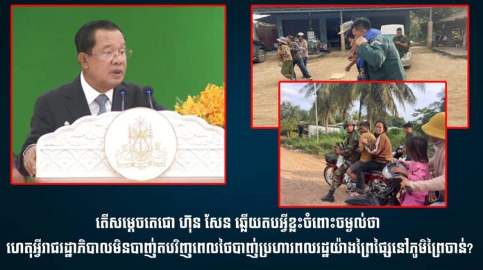 សម្ដេចតេជោ ហ៊ុន សែន ប្រធានព្រឹទ្ធសភាកម្ពុជា បានឆ្លើយនូវចម្ងល់មហាជនជាច្រើនដែលចោទសួរថា ពេលយោធាថៃបាញ់ប្រហារលើពលរដ្ឋស៊ីវិលនៅភូមិព្រៃចាន់ ហេតុអ្វីរាជរដ្ឋាភិបាលមិនបាញ់តបវិញ? ជុំវិញរឿងនេះ សម្ដេចតេជោ បានបញ្ជាក់ថា ប្រសិនបើផ្ទុះអាវុធ តើមានមនុស្សស្លាប់តែម្នាក់ និងរបួសបីនាក់នេះទេ? ប្រាកដណាស់គឺលើសពីនឹង។