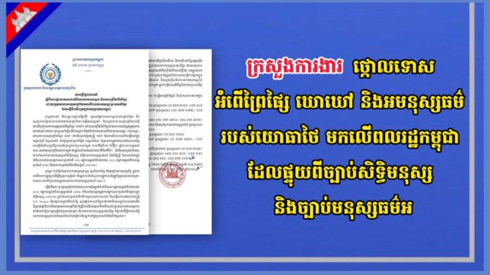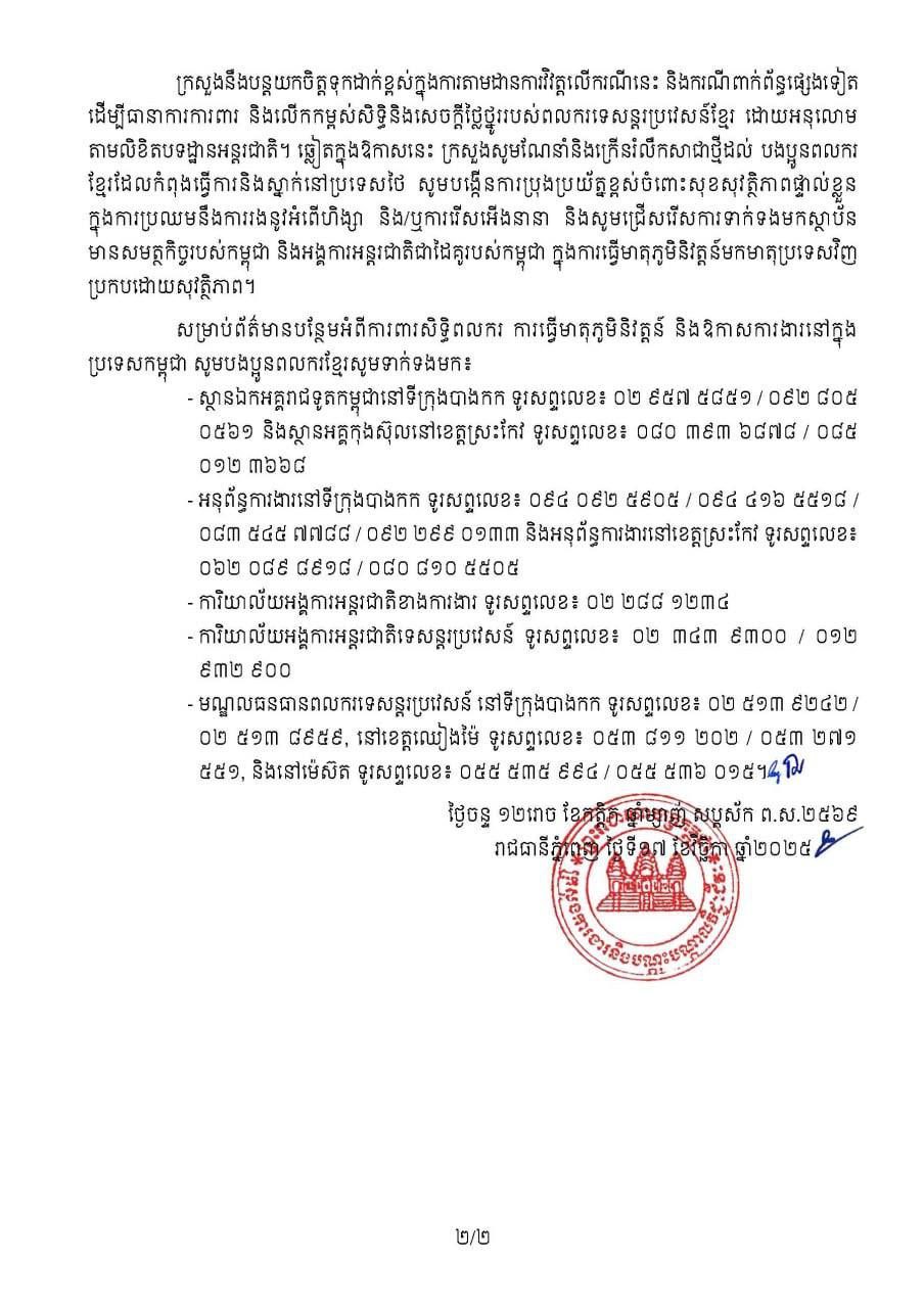 នៅថ្ងៃទី១៨ ខែវិច្ឆិកា ឆ្នាំ២០២៥ ក្រសួងការងារ និងបណ្តុះបណ្តាលវិជ្ជជីវៈសូមសម្តែងការសោកស្តាយយ៉ាងខ្លាំងបំផុត និងសូមប្រកាសថ្កោលទោសយ៉ាងដាច់អហង្ការចំពោះទង្វើអមនុស្សធម៌ ដែលក្រុមទាហានឈុតខ្មៅថៃបានធ្វើ មកលើក្រុមពលករទេសន្តរប្រវេសន៍ខ្មែរចំនួន ១៣នាក់ ដោយបានប្រើអំពើហិង្សាយ៉ាងសាហាវយង់ឃ្នងក្នុងរូបភាព ជាការវាយដំ ទាត់ធាក់ អុកស្វាយកាំភ្លើង ជំរិតទារប្រាក់ និងអំពើថោកទាបជាករណីរំលោភសេពសន្ថវៈ (រំលោភបូក) ដោយទាហានឈុតខ្មៅថៃចំនួន ៧នាក់ ទៅលើពលករខ្មែរជាស្ត្រី ១នាក់។
