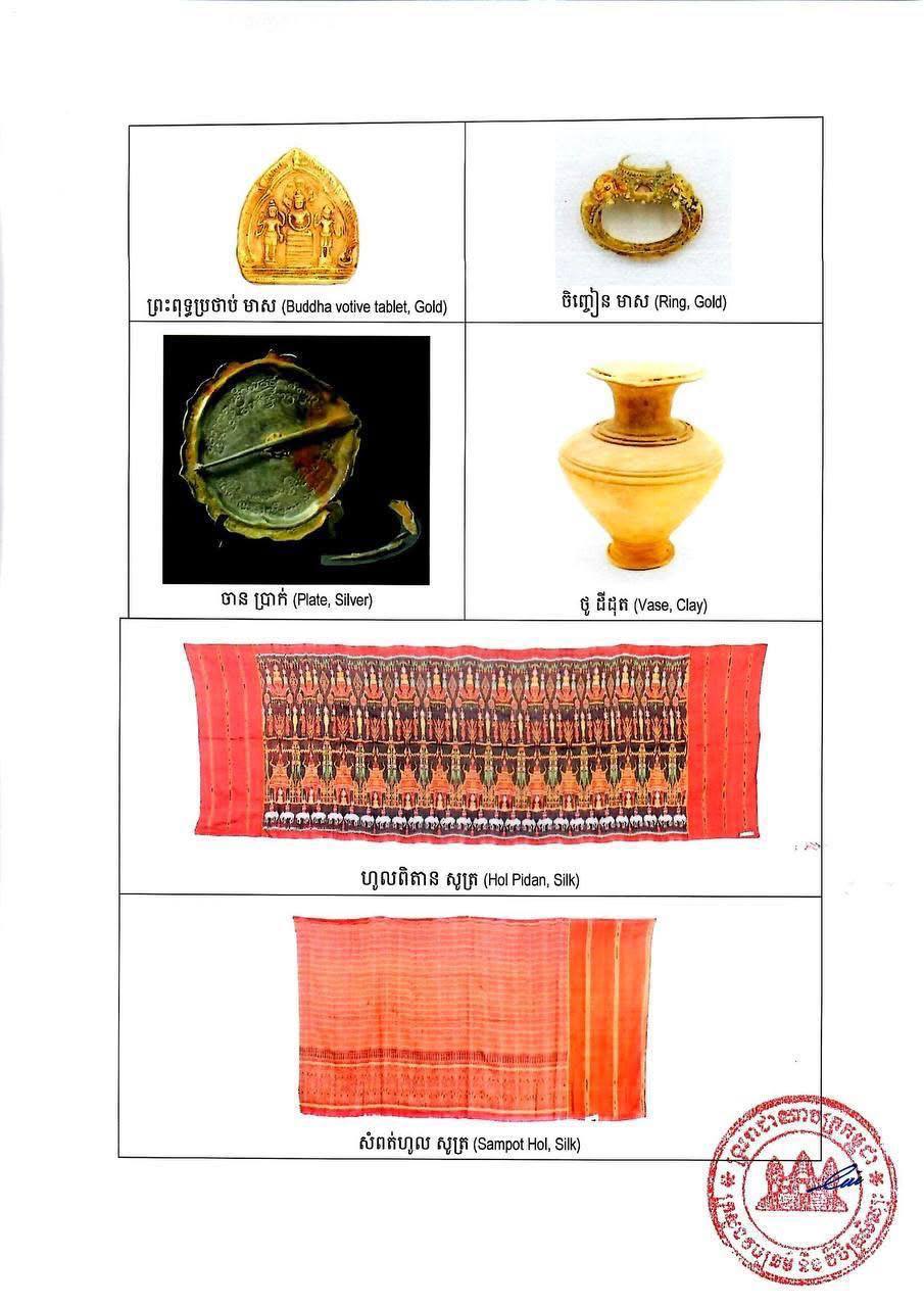 សម្ដេចធិបតី នាយករដ្ឋមន្រ្ដី បានបញ្ជាក់ថា រតនវត្ថុសិល្បៈខ្មែរដែលមាតុភូមិនិវត្តន៍មកកម្ពុជាវិញ រួមមាន៖ វាយនភណ្ឌសូត្រខ្មែរ ចំនួន ១៨៣ផ្ទាំង និងវត្ថុសម័យបុរេប្រវត្តិសាស្ត្រ ដូចជា៖ កាក់ អង្កាំ គ្រឿងអលង្ការ និងវត្ថុប្រើប្រាស់ធ្វើពីលោហធាតុមានតម្លៃ សំរិទ្ធ ថ្ម និងដីដុត ព្រមទាំងសមុច្ច័យសំខាន់ៗ ដូចជា៖ វត្ថុធ្វើអំពីថ្ម និងសំរិទ្ធ ក្នុងសម័យមុនអង្គរ និងសម័យអង្គរ គឺសុទ្ធសឹងជាកេរតំណែលពីបុព្វបុរសខ្មែរសម្រាប់កូនចៅជំនាន់ក្រោយ ដោយប្រៀបបាននឹងការវិលត្រឡប់នូវព្រលឹងដូនតាខ្មែរ៕