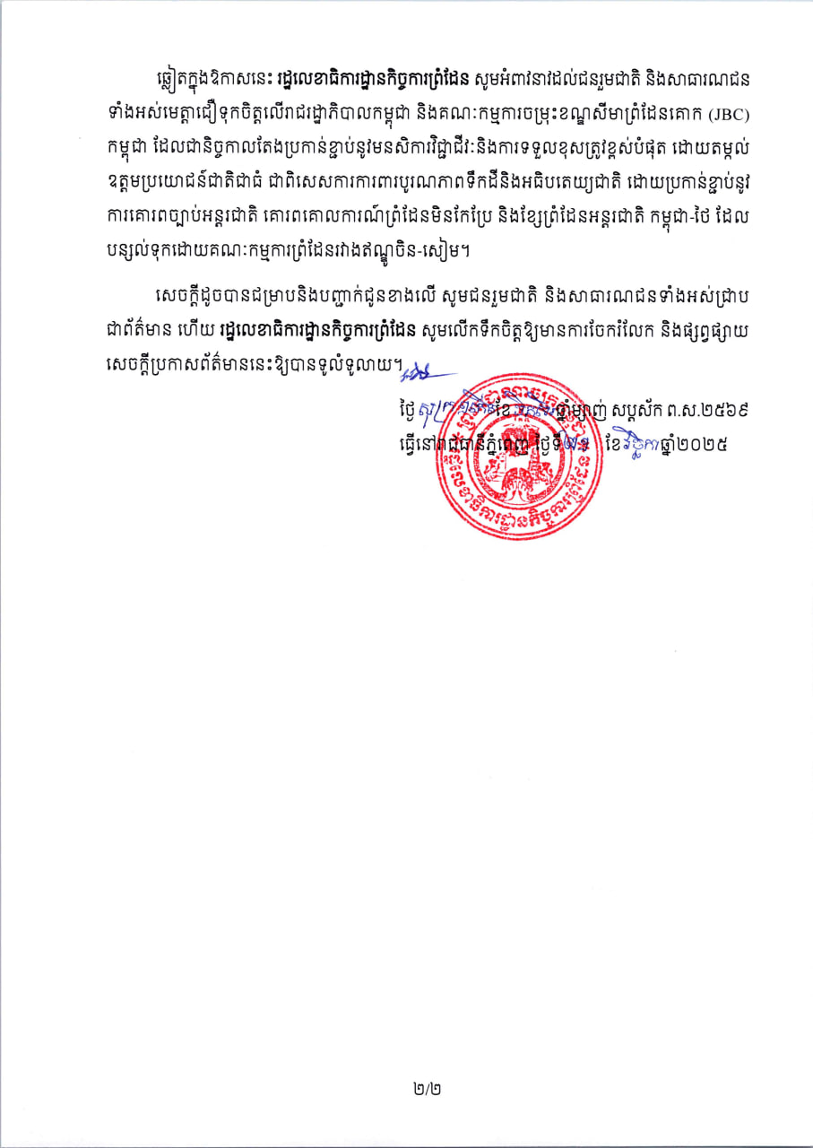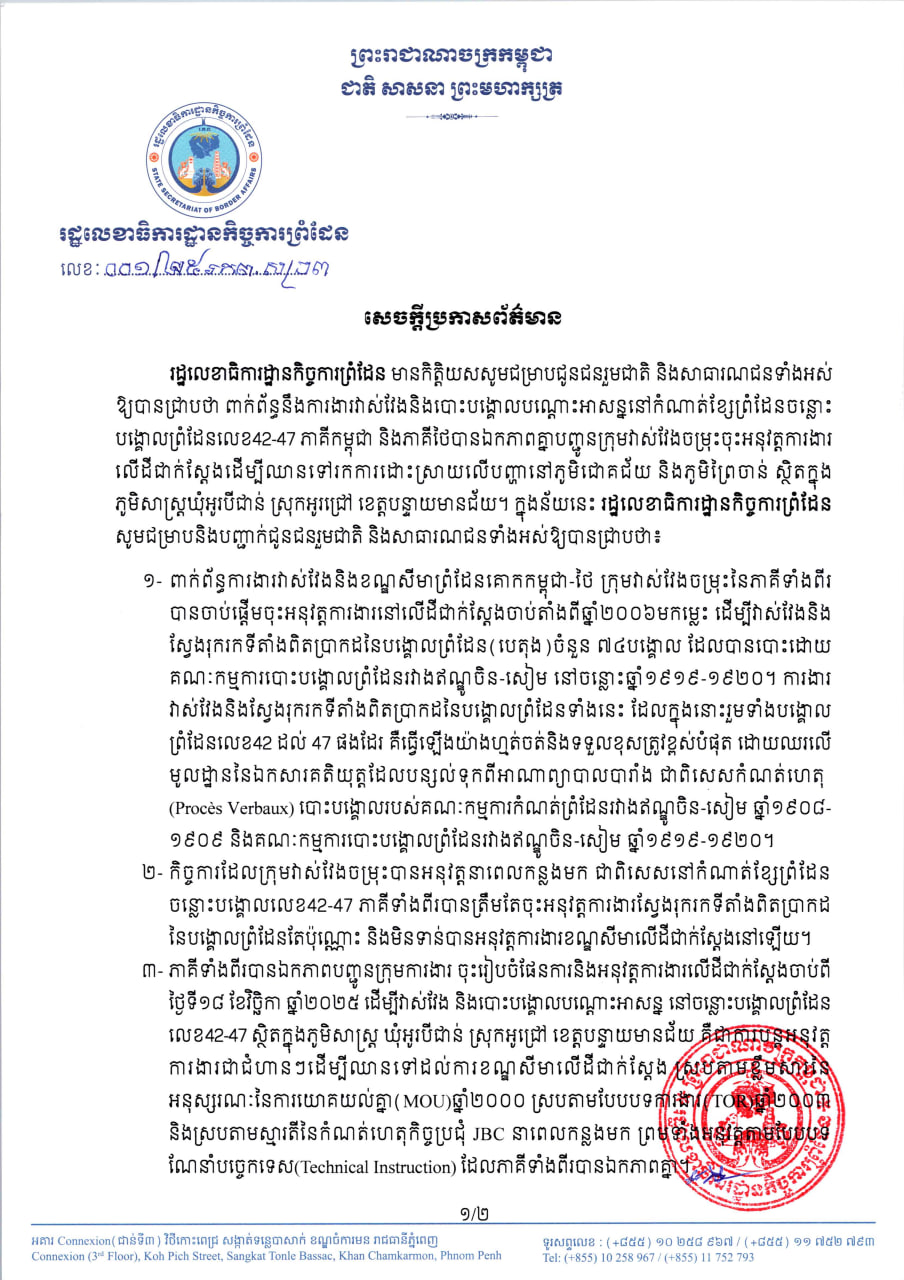 សេចក្តីប្រកាសព័ត៌មាន របស់រដ្ឋលេខាធិការដ្ឋានកិច្ចការព្រំដែន​ ពាក់ព័ន្ធនិងការងារវាស់វែងនិងបោះបង្គោលបណ្តោះអាសន្ននៅកំណាត់ខ្សែព្រំដែនចន្លោះបង្គោលព្រំដែនលេខ៤២-៤៧