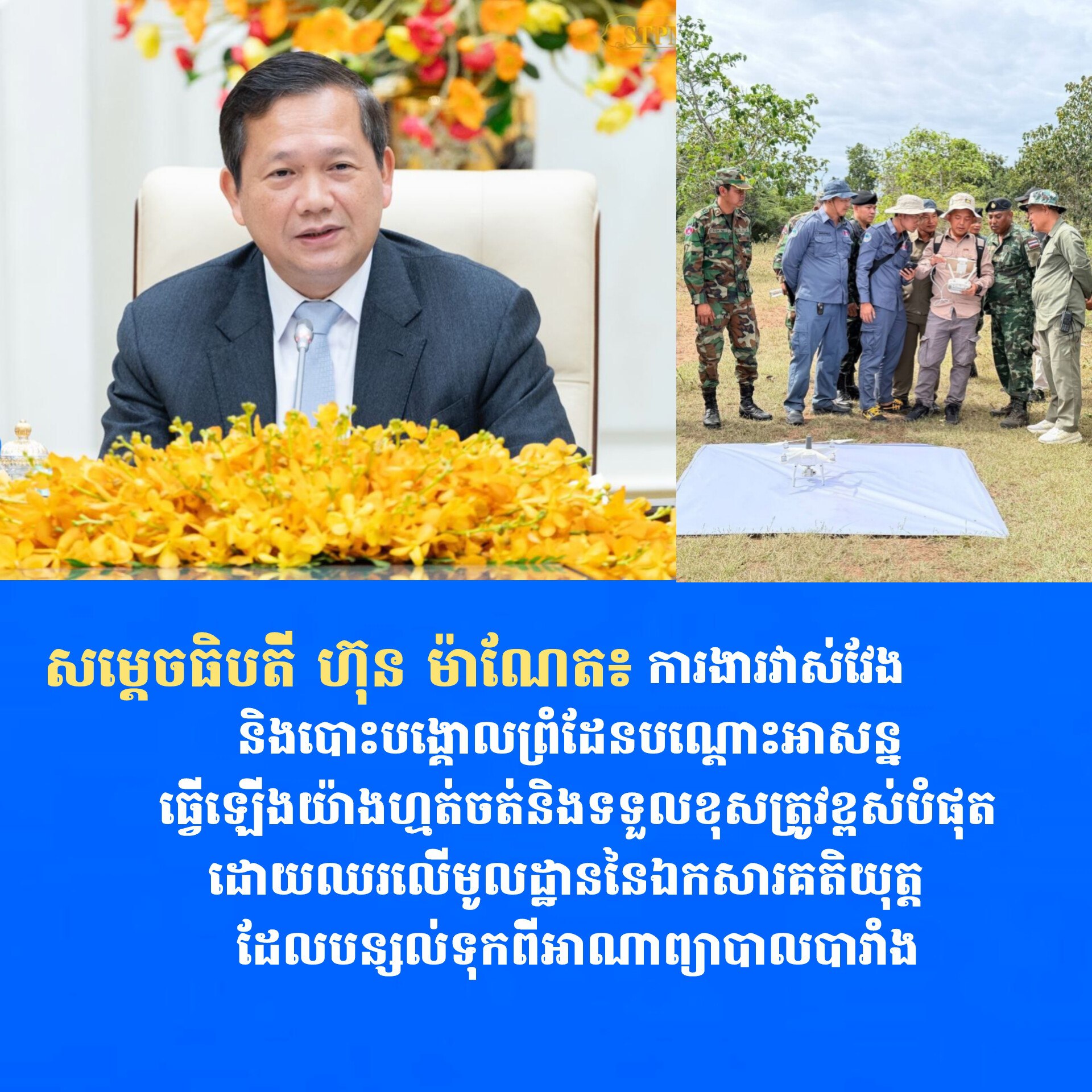 តាមរយៈបណ្តាញសង្គមរបស់សម្តេចធិបតី ហ៊ុន ម៉ាណែត នាយករដ្ឋមន្រ្តីនៃកម្ពុជានៅព្រឹកថ្ងៃទី២៥ ខែវិច្ឆិកា ឆ្នាំ២០២៥ បានឆ្លើយតបចំពោះមតិខ្លះដែលបានបង្ហាញការព្រួយបារម្ភចំពោះការវាស់វែងនិងបោះបង្គោលព្រំដែនបណ្ដោះអាសន្នជាមួយភាគីថៃ ដែលការពិតគឺភាគីទាំងពីរធ្វើឡើងប្រកបដោយភាពត្រឹមត្រូវ សុក្រិតភាពនិងតម្លាភាពដោយឈរលើមូលដ្ឋាននៃឯកសារគតិយុត្តដែលបន្សល់ទុកពីអាណាព្យាបាលបារាំង។