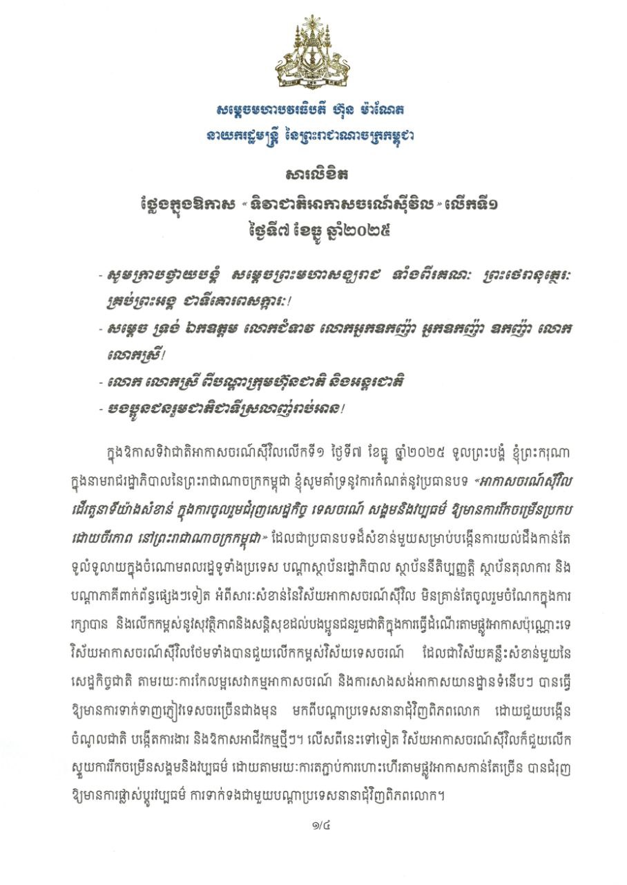 សារលិខិត ថ្លែងក្នុងឱកាស « ទិវាជាតិអាកាសចរណ៍ស៊ីវិល » លើកទី១ ថ្ងៃទី៧ ខែធ្នូ ឆ្នាំ២០២៥