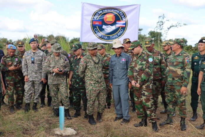 នៅរសៀល ថ្ងៃសុក្រ ទី៥ ខែធ្នូ ឆ្នាំ២០២៥ វេលាម៉ោង ១៤:៥៤នាទី ក្រុមសម្របសម្រួលកម្ពុជា (CLG) នៃព្រះរាជាណាចក្រកម្ពុជា បានសម្របសម្រួលជូនដល់ក្រុមអ្នកសង្កេតការណ៍អាស៊ាន (AOT) ចុះពិនិត្យ និងសង្កេតការណ៍ នៅចំណុចបង្គោលព្រំដែនលេខ ៥២-៥៣ នៅឃុំកំរៀង និងឃុំបឹងរាំង ស្រុកកំរៀង ខេត្តបាត់ដំបង ទល់មុខខេត្តចន្ទបុរី ប្រទេសថៃ។