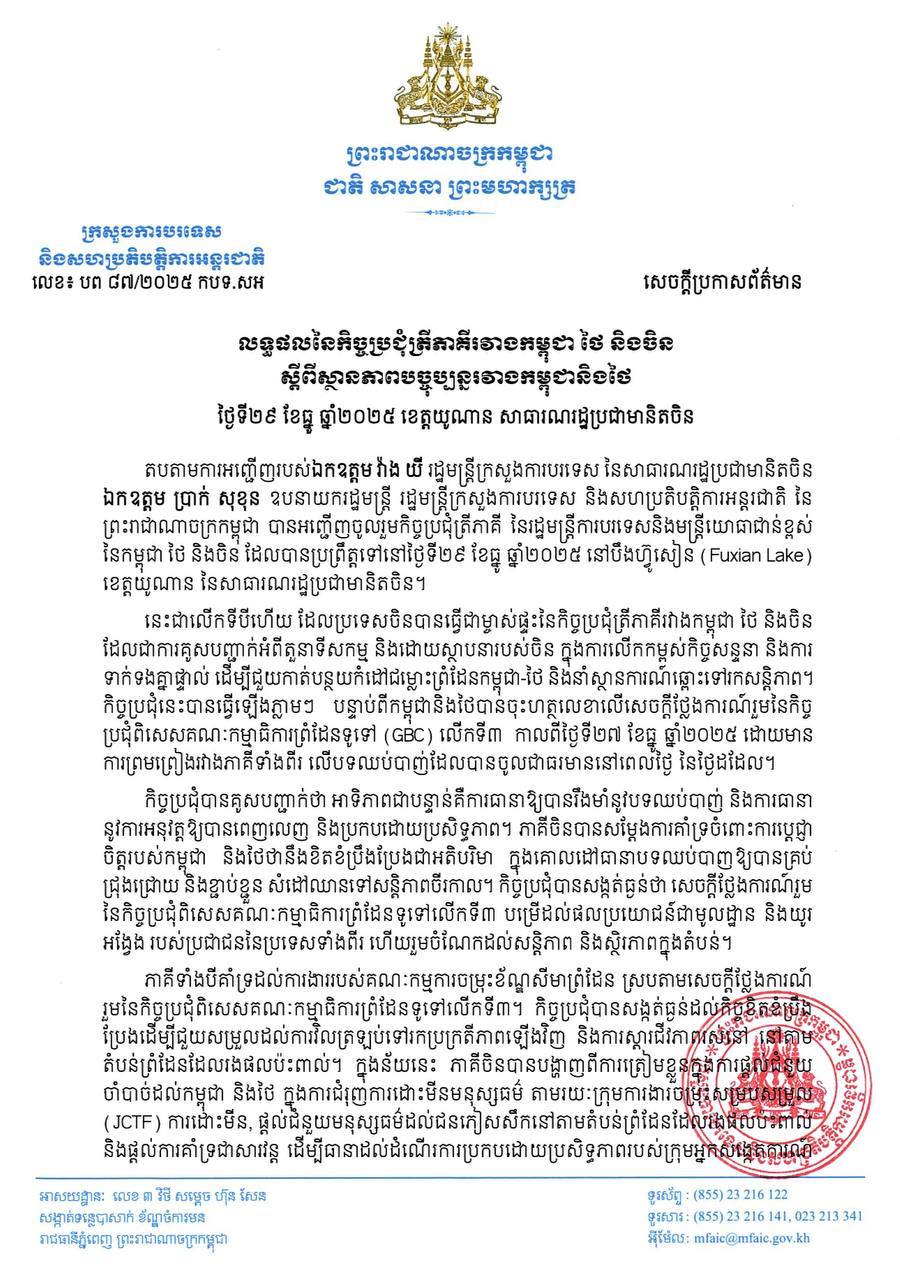 លទ្ធផលនៃកិច្ចប្រជុំត្រីភាគីរវាងកម្ពុជា ថៃ និងចិន ស្តីពីស្ថានភាពបច្ចុប្បន្នរវាងកម្ពុជានិងថៃ 30 December, 2025 លទ្ធផលនៃកិច្ចប្រជុំត្រីភាគីរវាងកម្ពុជា ថៃ និងចិន ស្តីពីស្ថានភាពបច្ចុប្បន្នរវាងកម្ពុជានិងថៃ ថ្ងៃទី២៩ ខែធ្នូ ឆ្នាំ២០២៥ ខេត្តយូណាន សាធារណរដ្ឋប្រជាមានិតចិន ចែករំលែក FacebookTwitterTelegramWhatsAppEmail ពត៌មានទាក់ទង ឯកអគ្គរដ្ឋទូតចប់អាណត្តិនៃសាធារណរដ្ឋតួកគីយ៉េ៖ កម្ពុជា-តួ... កម្ពុជា-បារាំង ប្តេជ្ញាពង្រឹង និងពង្រីកកិច្ចសហប្រតិបត្ត... កម្ពុជា-វៀតណាម ប្ដេជ្ញាពង្រឹង និងពង្រីកកិច្ចសហប្រតិបត្ត... ក្រុមហ៊ុន CCCC បង្ហាញបំណងពង្រីកការវិនិយោគបន្ថែមនៅកម្ពុជ... សេចក្ដីប្រកាសព័ត៌មាន ស្ដីពីលទ្ធផលនៃទស្សនកិច្ចការងាររបស់... ខ្លឹមសារ Press Briefing របស់ឯកឧត្តម ប៉ែន បូណា ប្រធានអង្... Press OCM - អង្គភាពព័ត៌មាន និងប្រតិកម្មរហ័ស ពត៌មានផ្សេងៗ សេចក្ដីប្រកាសព័ត៌មាន ស្ដីពីលទ្ធផលនៃទស្សនកិច្ចការងាររបស់សម្ដេចធិបតីនាយករដ្ឋមន្រ្ដ... 10 April, 2026 សេចក្ដីប្រកាសព័ត៌មាន ស្ដីពីលទ្ធផលនៃទស្សនកិច្ចការងាររបស់សម្ដេចធិបតីនាយករដ្ឋមន្រ្ដី នៅសាធារណរដ្ឋបារាំង ខ្លឹមសារ Press Briefing របស់ឯកឧត្តម ប៉ែន បូណា ប្រធ... 10 April, 2026 វិចារណកថា៖ ភារកិច្ចដើម្បីសម្រេចបាននូវផលិតកម្មបៃតង 10 April, 2026 កម្ពុជានៅតែប្រកាន់ខ្ជាប់យ៉ាងមុតមាំ ឥតងាករេចំពោះខ្ល... 9 April, 2026