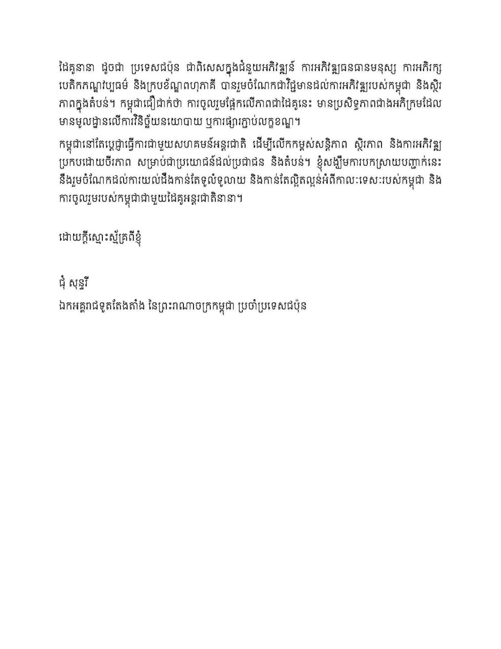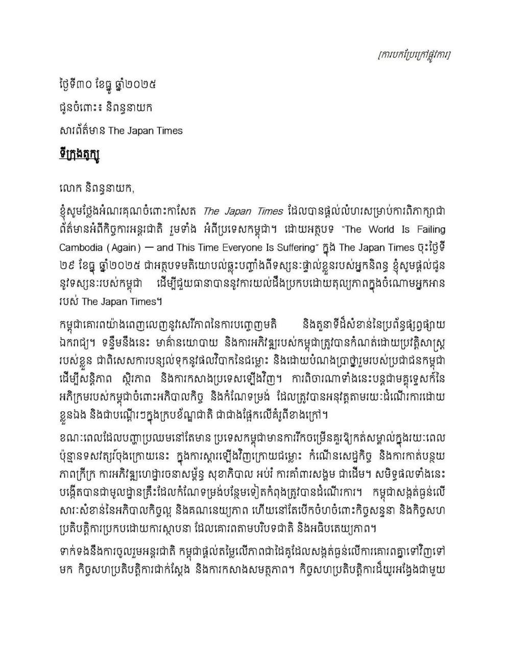លិខិតបំភ្លឺរបស់ស្ថានឯកអគ្គរាជទូតកម្ពុជា ប្រចាំប្រទេសជប៉ុន ផ្ញើទៅកាន់ និពន្ធនាយក របស់សារព័ត៌មាន The Japan Times