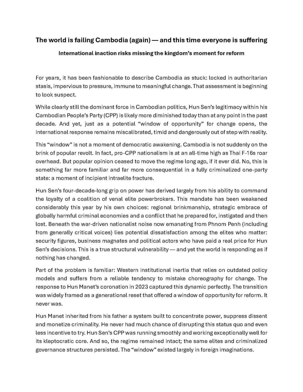 ឆ្លើយតបទៅនឹងអត្ថបទដែលបានចុះផ្សាយដោយសារព័ត៌មាន The Japan Times មានចំណងជើងថា “ពិភពលោកកំពុងបរាជ័យ នៅកម្ពុជា (ម្តងទៀត) និងលើកនេះគ្រប់គ្នាកំពុងឈឺចាប់ (The World is Failing Cambodia (Again) and This Time Everyone is Suffering)” ចុះថ្ងៃទី២៩ ខែធ្នូ ឆ្នាំ២០២៥ ស្ថានទូតកម្ពុជាបានផ្ញើលិខិតបំភ្លឺទៅកាន់ អ្នកនិពន្ធនាយក របស់សារព័ត៌មាន The Japan Times កាលពីថ្ងៃទី៣០ ខែធ្នូ ឆ្នាំ២០២៥ ពាក់ព័ន្ធនឹងទស្សនៈរបស់កម្ពុជា ក្នុងការធានាឱ្យបាននូវតុល្យភាព និងការយល់ដឹងបន្ថែមទៀត ក្នុងចំណោមសាធារណជន៕