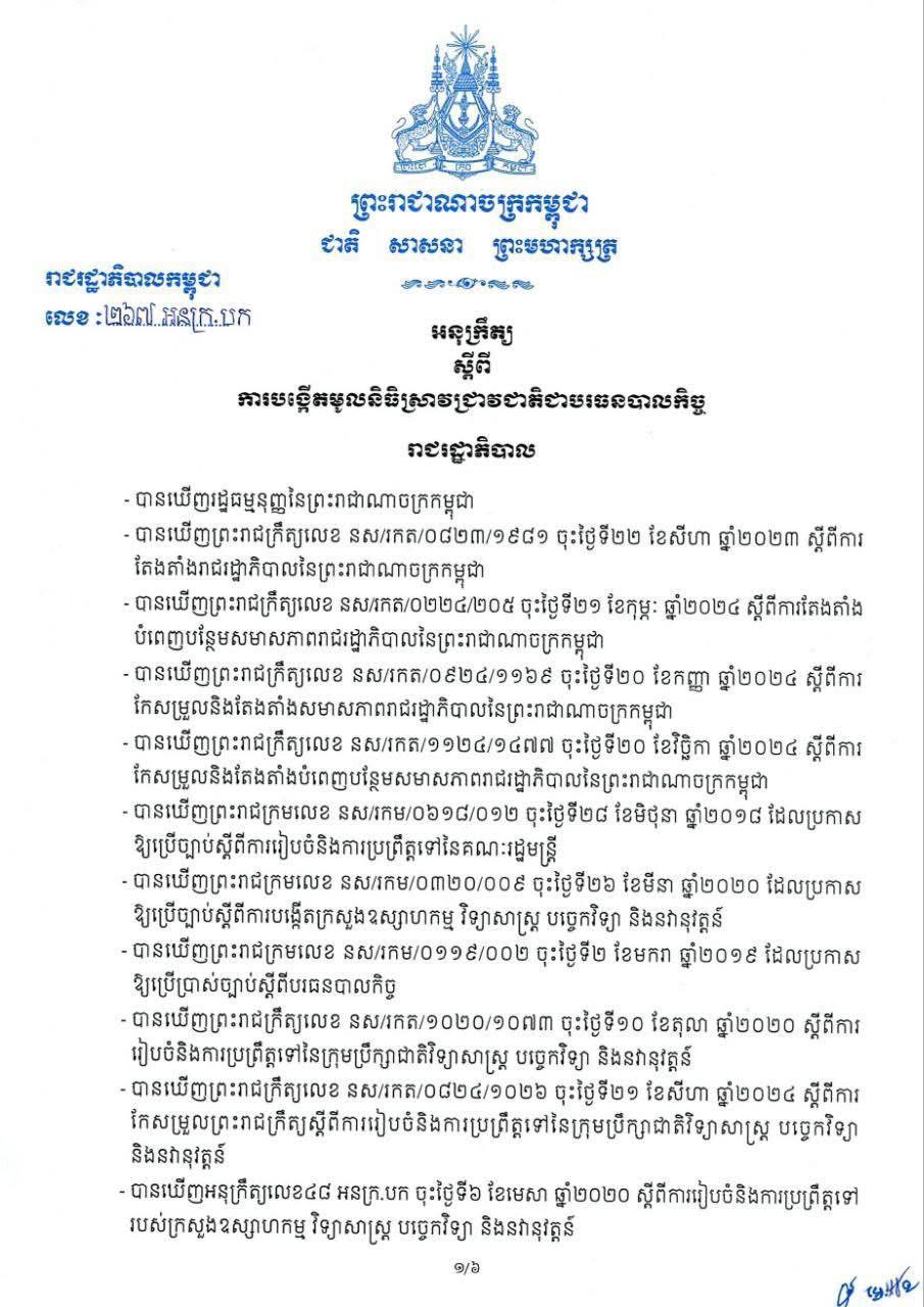 សម្តេចបវរធិបតី ហ៊ុន ម៉ាណែត ចេញអនុក្រឹត្យ ស្តីពីការបង្កើតមូលនិធិស្រាវជ្រាវជាតិជាបរធនបាលកិច្ច 20 January, 2026 (ភ្នំពេញ)៖ សម្តេចបវរធិបតី ហ៊ុន ម៉ាណែត នាយករដ្ឋមន្ត្រីនៃកម្ពុជា បានចេញអនុក្រឹត្យ ស្តីពីការបង្កើតមូលនិធិស្រាវជ្រាវជាតិជាបរធនបាលកិច្ច។ ខាងក្រោមនេះជាអនុក្រឹត្យរបស់សម្តេចបវរធិបតី ហ៊ុន ម៉ាណែត៖ ចែករំលែក FacebookTwitterTelegramWhatsAppEmail ពត៌មានទាក់ទង ឯកអគ្គរដ្ឋទូតចប់អាណត្តិនៃសាធារណរដ្ឋតួកគីយ៉េ៖ កម្ពុជា-តួ... កម្ពុជា-បារាំង ប្តេជ្ញាពង្រឹង និងពង្រីកកិច្ចសហប្រតិបត្ត... កម្ពុជា-វៀតណាម ប្ដេជ្ញាពង្រឹង និងពង្រីកកិច្ចសហប្រតិបត្ត... ក្រុមហ៊ុន CCCC បង្ហាញបំណងពង្រីកការវិនិយោគបន្ថែមនៅកម្ពុជ... សេចក្ដីប្រកាសព័ត៌មាន ស្ដីពីលទ្ធផលនៃទស្សនកិច្ចការងាររបស់... ខ្លឹមសារ Press Briefing របស់ឯកឧត្តម ប៉ែន បូណា ប្រធានអង្... Press OCM - អង្គភាពព័ត៌មាន និងប្រតិកម្មរហ័ស ពត៌មានផ្សេងៗ សេចក្ដីប្រកាសព័ត៌មាន ស្ដីពីលទ្ធផលនៃទស្សនកិច្ចការងាររបស់សម្ដេចធិបតីនាយករដ្ឋមន្រ្ដ... 10 April, 2026 សេចក្ដីប្រកាសព័ត៌មាន ស្ដីពីលទ្ធផលនៃទស្សនកិច្ចការងាររបស់សម្ដេចធិបតីនាយករដ្ឋមន្រ្ដី នៅសាធារណរដ្ឋបារាំង ខ្លឹមសារ Press Briefing របស់ឯកឧត្តម ប៉ែន បូណា ប្រធ... 10 April, 2026 វិចារណកថា៖ ភារកិច្ចដើម្បីសម្រេចបាននូវផលិតកម្មបៃតង 10 April, 2026 កម្ពុជានៅតែប្រកាន់ខ្ជាប់យ៉ាងមុតមាំ ឥតងាករេចំពោះខ្ល... 9 April, 2026