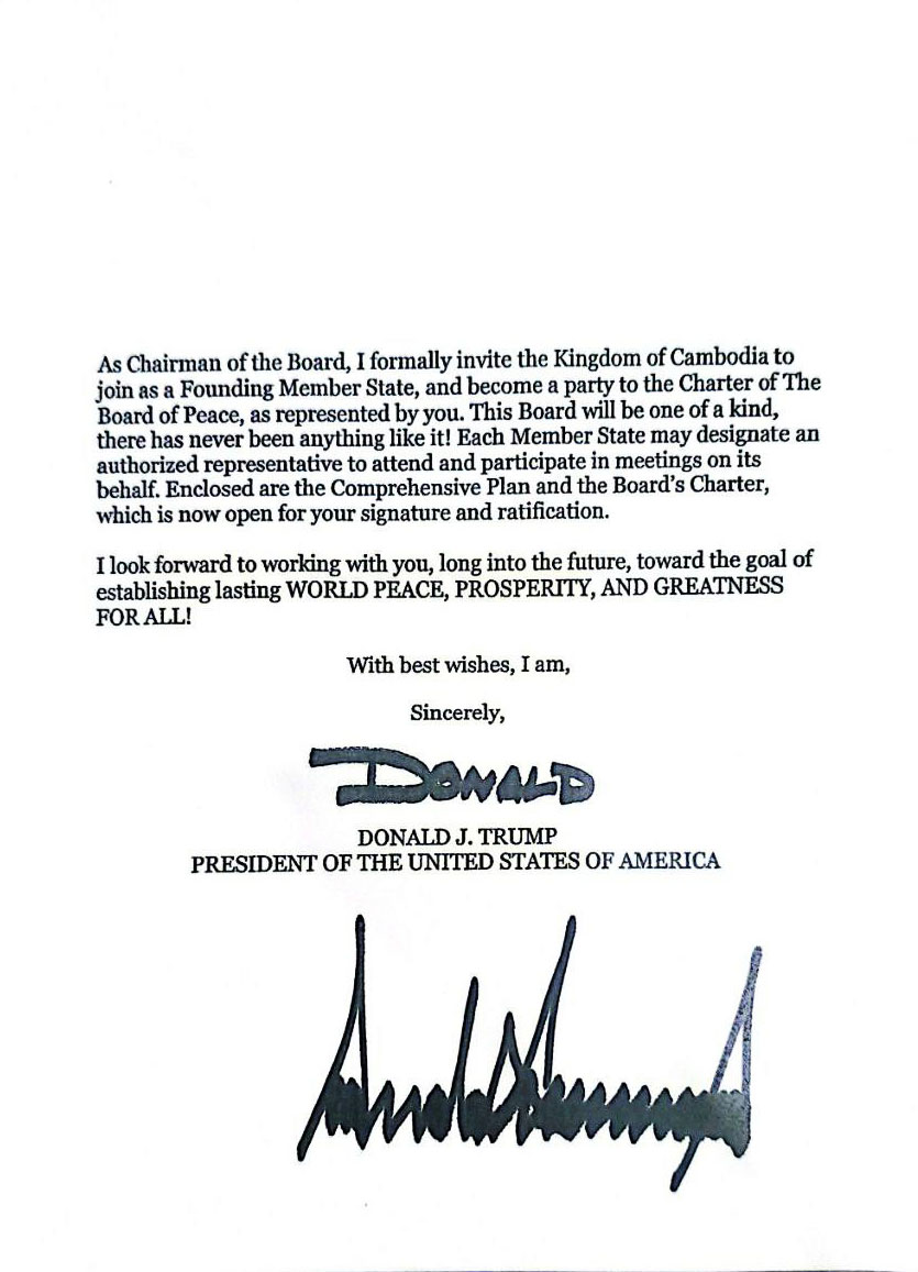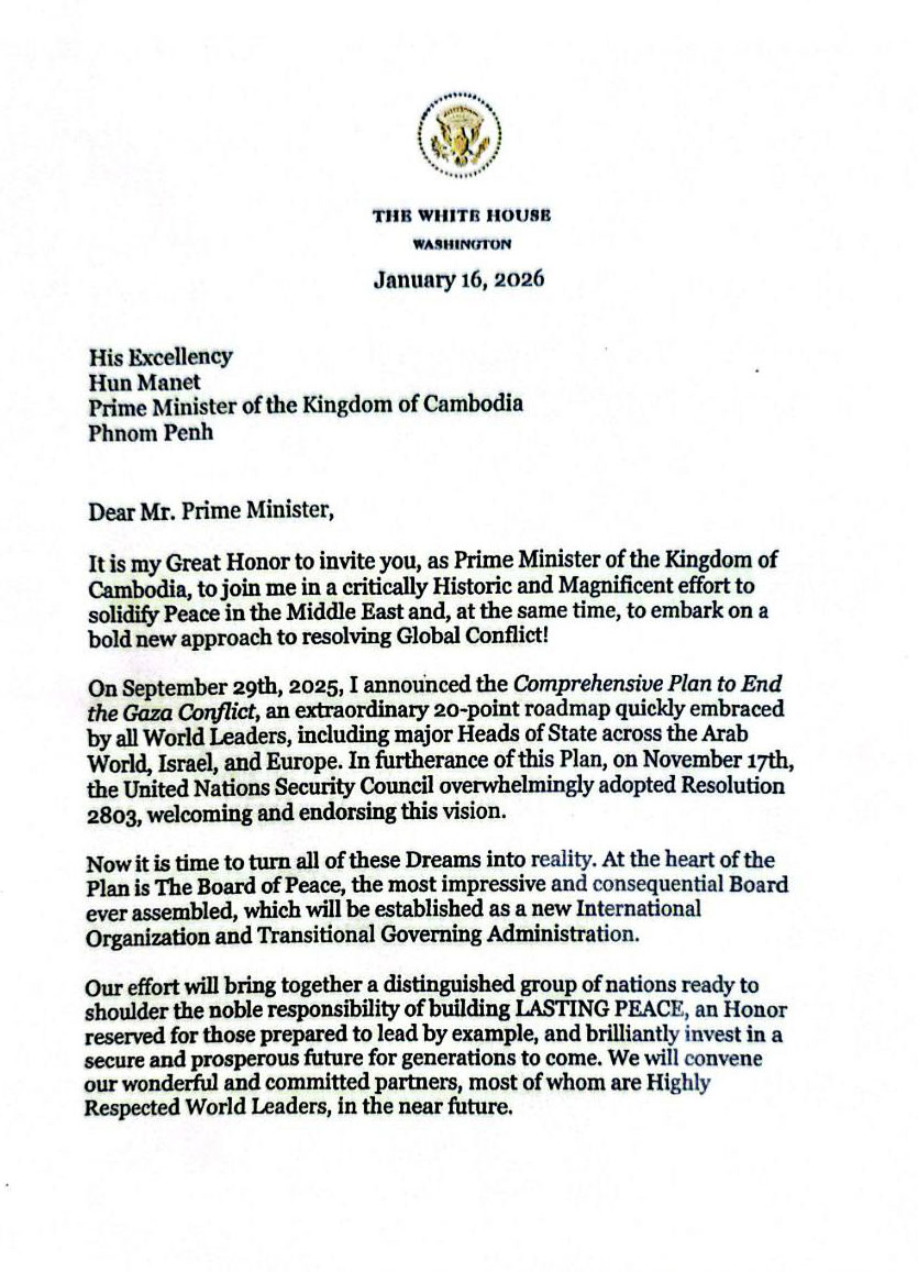 សហរដ្ឋអាមេរិកបានអញ្ជើញកម្ពុជាចូលរួមជារដ្ឋសមាជិកស្ថាបនិក នៃក្រុមប្រឹក្សាសន្តិភាព និងជាភាគីនៃធម្មនុញ្ញរបស់ក្រុមប្រឹក្សាសន្តិភាព។ នេះបើយោងតាមសារលិខិតរបស់ ឯកឧត្តម ដូណាល់ ជេ ត្រាំ ប្រធានាធិបតីសហរដ្ឋអាមេរិក ជូនចំពោះសម្តេចមហាបវរធិបតី ហ៊ុន ម៉ាណែត នាយករដ្ឋមន្ត្រីនៃព្រះរាជាណាចក្រកម្ពុជា ចុះថ្ងៃទី១៦ ខែមករា ឆ្នាំ២០២៦ និងត្រូវបានផ្សព្វផ្សាយនាយប់ថ្ងៃទី២១ ខែមករា នេះ។