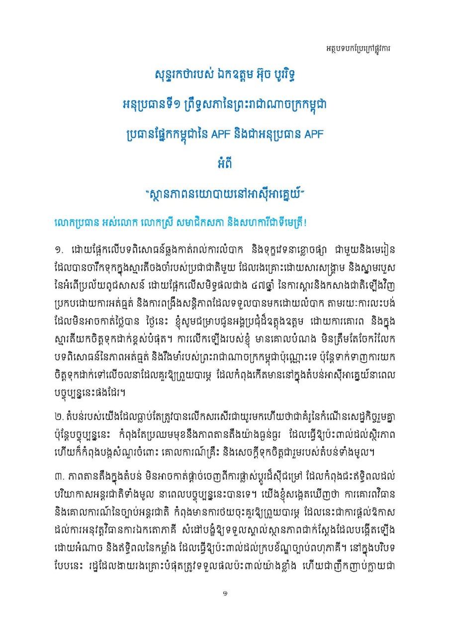 សុន្ទរកថារបស់ឯកឧត្តម អ៊ុច បូររិទ្ធ អនុប្រធានទី១ ព្រឹទ្ធសភា ប្រធានក្រុមសភាជាតិកម្ពុជា នៃសភាប្រើភាសាបារាំង (APF) និងជាអនុប្រធានសភាប្រើភាសាបារាំង អំពី «ស្ថានភាពនយោបាយនៅអាស៊ីអាគ្នេយ៍» នៅសភាប្រទេសម៉ុងតេណេហ្គ្រោ