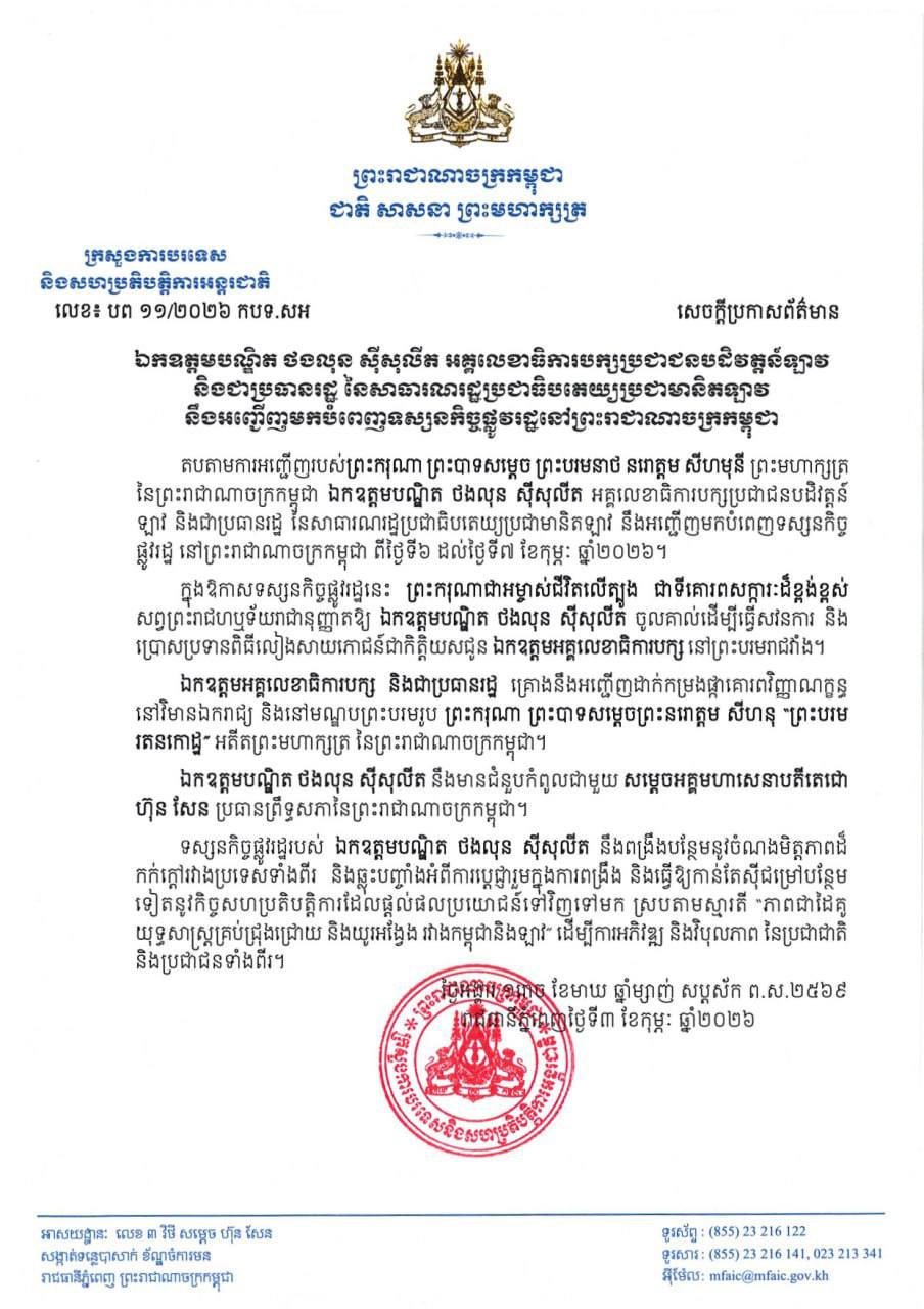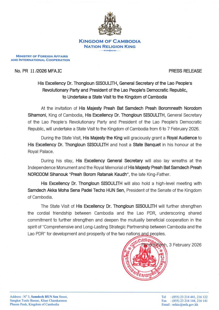 ឯកឧត្តមបណ្ឌិត ថងលុន ស៊ីសុលីត អគ្គលេខាធិការបក្សប្រជាជនបដិវត្តន៍ឡាវ និងជាប្រធានរដ្ឋ នៃសាធារណរដ្ឋប្រជាធិបតេយ្យប្រជាមានិតឡាវ នឹងអញ្ជើញមកបំពេញទស្សនកិច្ចផ្លូវរដ្ឋនៅព្រះរាជាណាចក្រកម្ពុជាចាប់ពីថ្ងៃទី៦ ដល់ថ្ងៃទី៧ ខែកុម្ភៈ ឆ្នាំ២០២៦ ដើម្បីពង្រឹងបន្ថែមនូវចំណងមិត្តភាពដ៏កក់ក្តៅរវាងប្រទេសទាំងពីរ និងឆ្លុះបញ្ចាំងអំពីការប្តេជ្ញារួមក្នុងការពង្រឹង និងធ្វើឱ្យកាន់តែស៊ីជម្រៅបន្ថែមទៀតនូវកិច្ចសហប្រតិបត្តិការដែលផ្ដល់ផលប្រយោជន៍ទៅវិញទៅមក ស្របតាមស្មារតី «ភាពជាដៃគូ យុទ្ធសាស្ត្រគ្រប់ជ្រុងជ្រោយ និងយូរអង្វែងរវាងកម្ពុជានិងឡាវ» ដើម្បីការអភិវឌ្ឍ និងវិបុលភាព នៃប្រជាជាតិ និងប្រជាជនទាំងពីរ។
